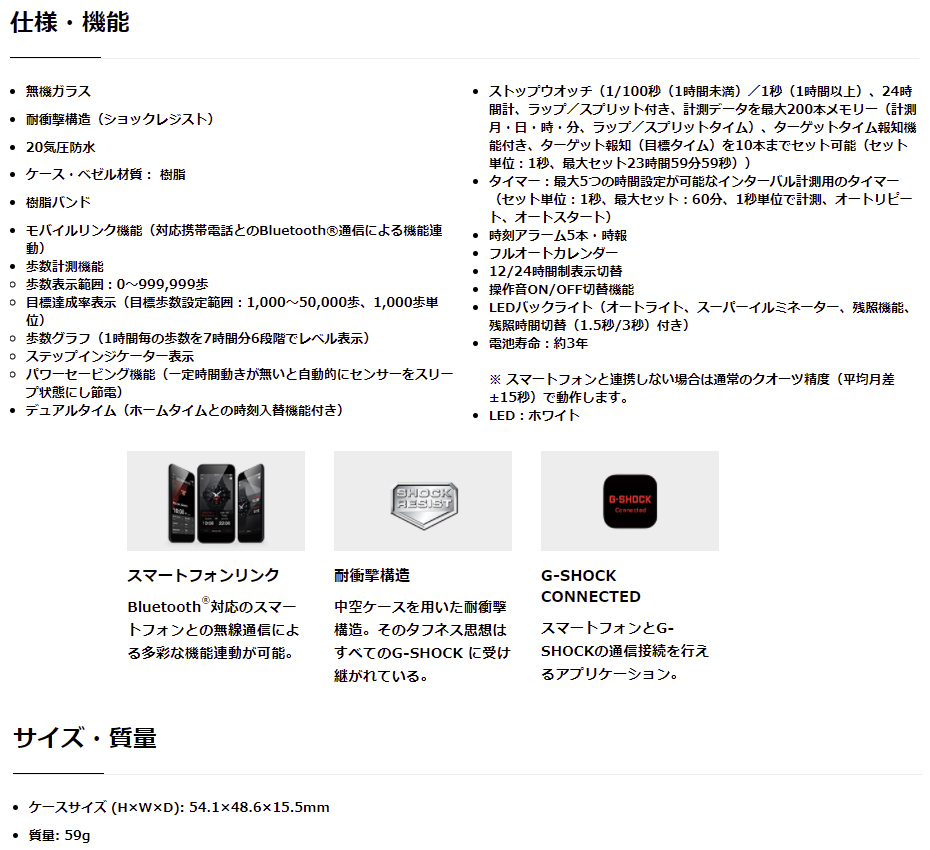 ■G-SHOCKのスポーツラインからNewモデルが登場。今回はファッションやトレーニングシーンでも馴染みやすく実用的なカラーであるユーティリティカラーをラインアップ。様々なウェアや環境にもマッチするデザインに仕上げました。機能面では専用アプリケーション「G-SHOCK Connected」と連携し、ワークアウトに適した機能で個々の活動をアシスト。3軸加速度センサーによる歩数計測機能、最大5本×20セットのマルチタイマー、ラップメモリー最大200本など日常の健康管理、体力維持向上に役立ちます。また、アプリ連携により5段階運動強度付歩数ログ、カロリー算出や目標歩数設定、更にタイマーメニュー作成+転送、ストップウオッチ計測データ保管、データ一括確認など、トレーニングメニューの簡単作成や活動記録により、身近にスポーツを楽しめます。アプリ連携による自動時刻修正など時計本来の価値も追求し、暗所などでのワークアウトにも役立つオートLEDライトなど実用性も備えます。装着性を高めるためバンド裏面の根元部にバックウイングや、新形状の遊環によるズレ防止を備え、細かくフィッティング調整ができるようバンド穴の数を多く設けました。これにより、サイズの微妙な調整が可能です。・スマートフォンリンク(5段階運動強度付歩数ログ、カロリー算出、タイマーメニュー作成、ストップウオッチ計測データログ、自動時刻修正(1日4回)、ワールドタイム約300都市対応、時刻入替、アラーム、簡単時計設定、携帯電話探索機能など)・3軸加速度センサーによる歩数計測機能(歩数グラフ、目標達成率グラフィック表示付き)・ターゲットタイム報知機能付きストップウオッチ(ラップ/スプリット表示切替、ターゲットタイム最大10本、ラップメモリー最大200本)・最大5つの時間設定が可能なインターバル計測用のタイマー(オートリピート最大20回、スキップ、オートスタート、予告音付き)・高輝度なオートLEDライト(スーパーイルミネーター)