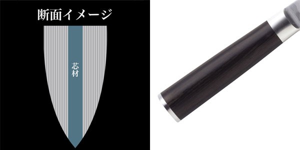 ●日本刀のように硬い高硬度ステンレス鋼が軟質部で包みこまれ、曲がりにくく折れにくい(強靭性)