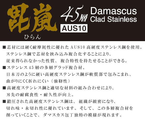 ●芯材には、硬く、耐摩耗性に優れたAUS10高硬度ステンレス鋼を使用しています。