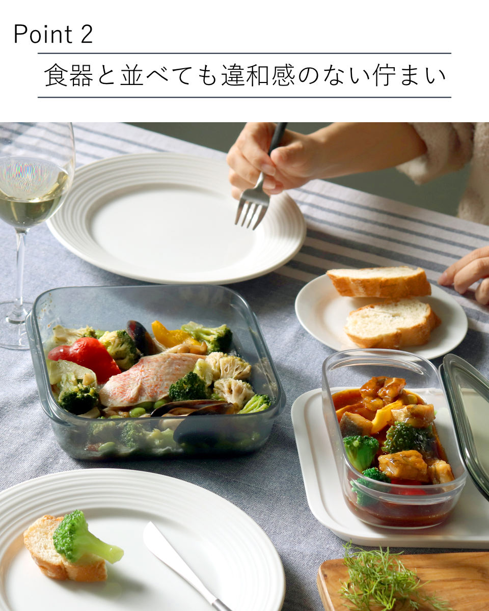 ガラスの器のような見た目は食器と一緒に食卓に並べても違和感がありません。保存していた食品を容器に入れたまま食卓に出せるので、準備と後片付けがラクになります。
