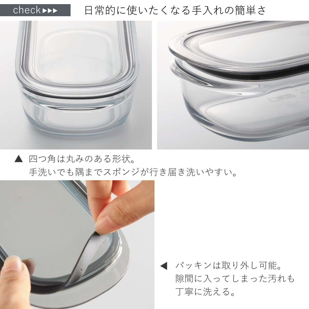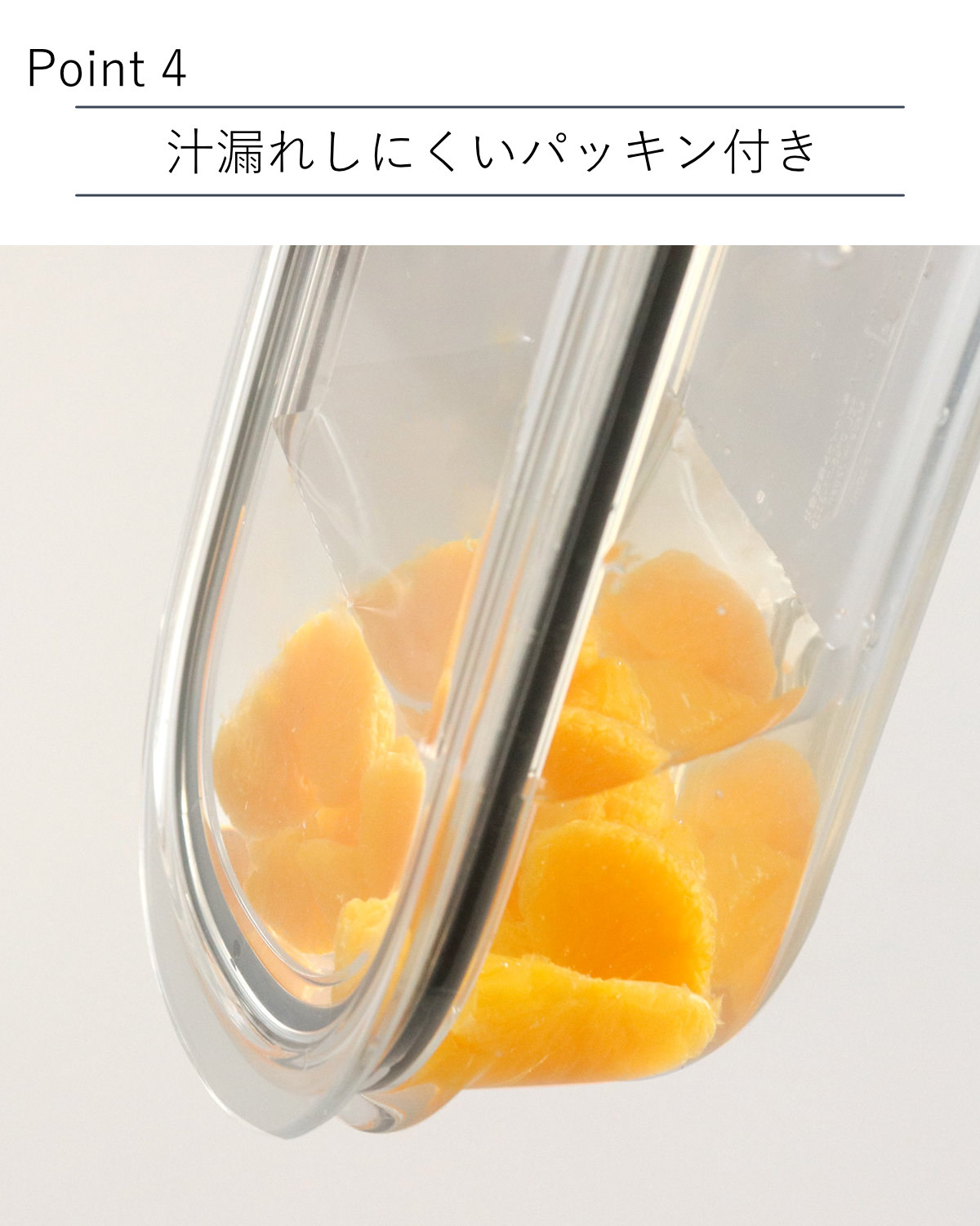 フタにはパッキンが付いているので密閉性が高く、汁気のある物も保存が可能です。液体やにおいの漏れを軽減してくれます。