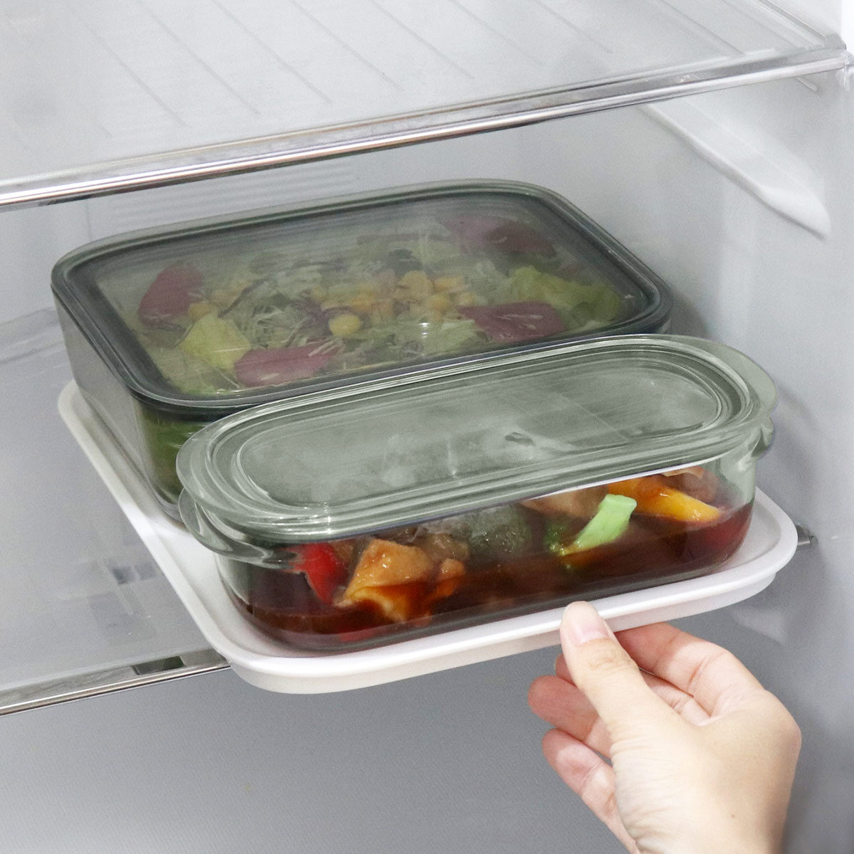 保存容器がピッタリ収まるシリーズ専用トレー(別売)。保存容器をのせておけば、冷蔵庫からまとめて取り出したり、食卓に並べたりが手軽に。より冷蔵庫の整頓がしやすくなります。