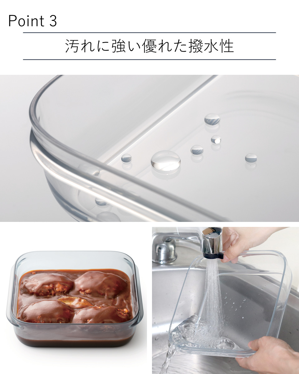 撥水性に優れた素材を使用しているので、食品からの色移りや汚れ、においが付きにくいです。カレーやシチュー、トマトソース系の色の濃い料理も安心。サッと洗うだけで汚れもヌメリも残らず、清潔に保ちやすいです。