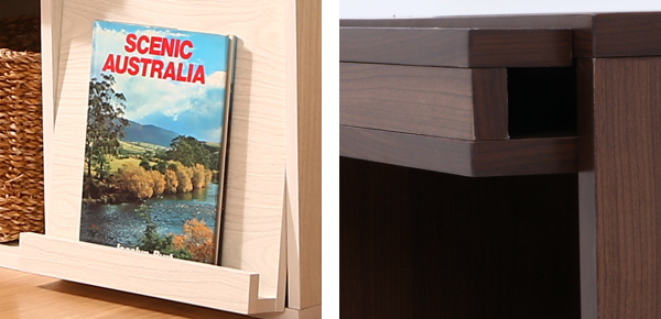 お気に入りの本や雑誌などをフラップ扉に立て掛けることができます。雑誌などを置いたままでも扉の開閉が可能です。