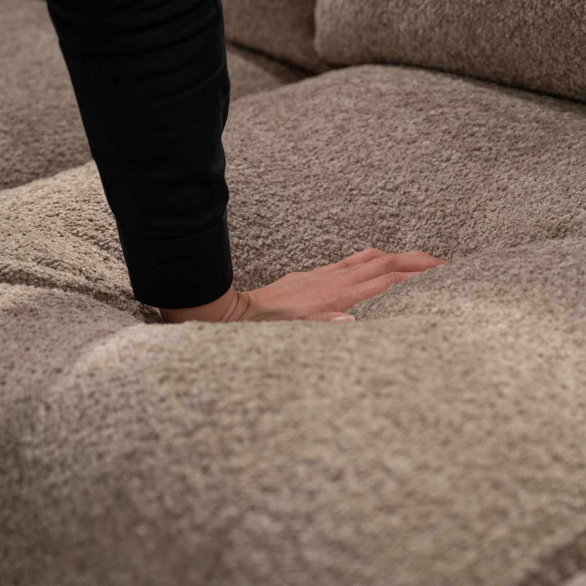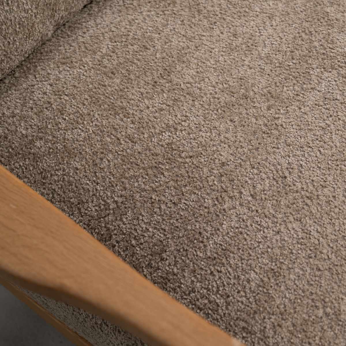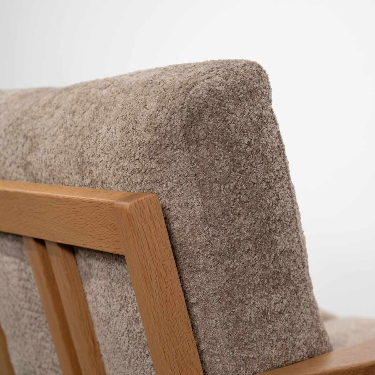 クッションの表面には凹凸のある表情が魅力のブークレ生地を使用。カジュアルな雰囲気で、温かみのあるオーク材のフレームとの相性も抜群です。表面のループが大きいのが特徴で、独特の柔らかさと肌触りの良さが、ソファの座り心地を高めています。