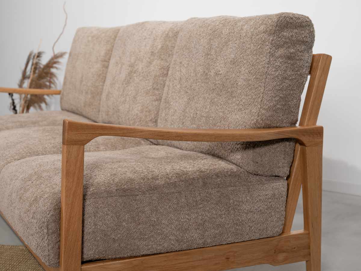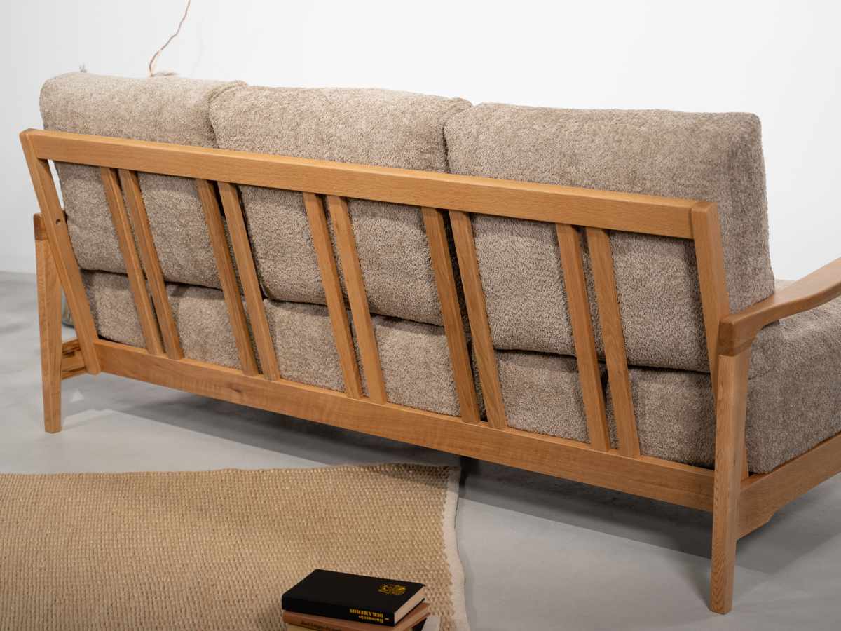 天然木オークのフレームと、ほっこりとしたブークレ生地のクッションが柔らかな印象のソファです。背面・座面ともにボリューム感のある設計で、クッション性も抜群。ゆったりとおくつろぎいただけます。