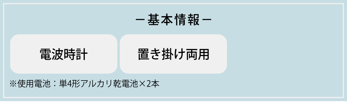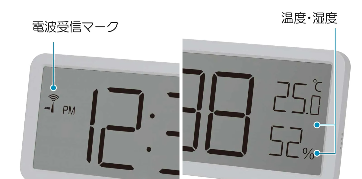 時刻表示に加え、室内の温度・湿度を同時にチェックできる便利な仕様です。また、電波受信状態が分かるマーク付きなので、正確な時刻に自動調整されているかも確認できます。