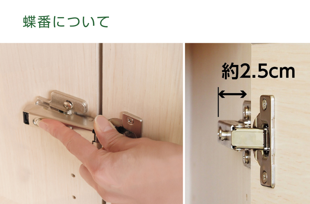 ※蝶番を取り付けした箇所は、ラックの内寸が蝶番の厚み分(約2.5cm)狭くなります。