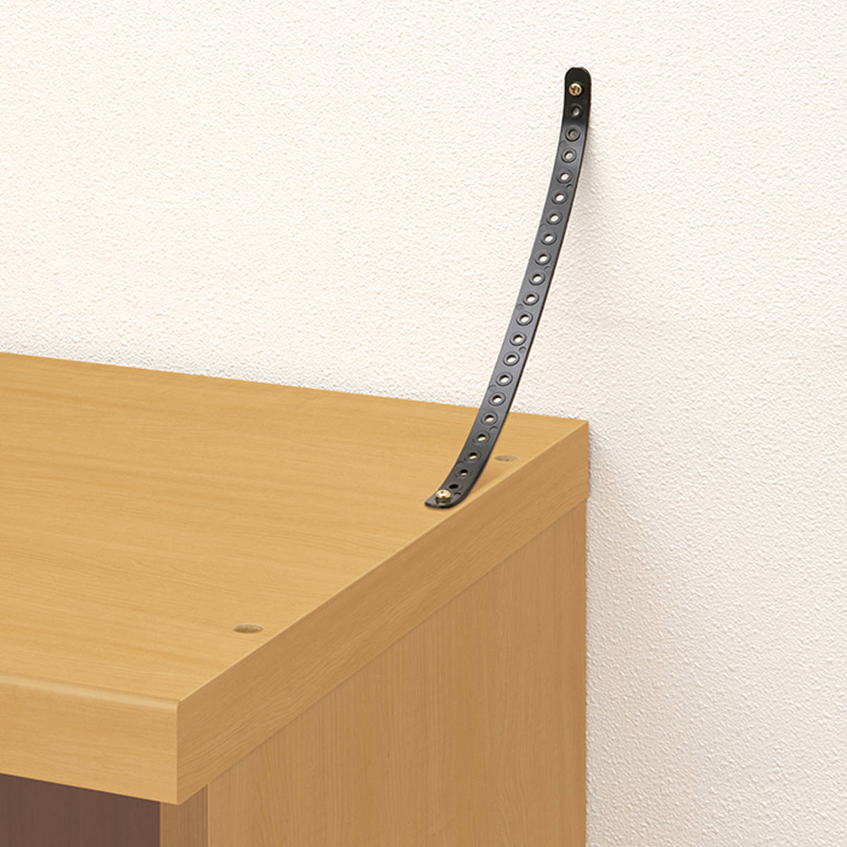 シューズボックス本体とお部屋の壁を固定し、地震時の転倒・移動を防ぐ転倒防止補助バンド付きです。