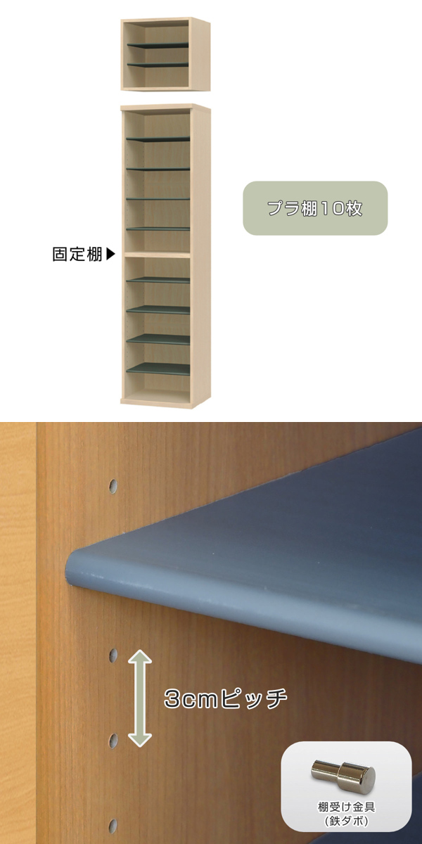 プラ棚は3cmピッチで調整できる可動式です。靴の高さに合わせて調整できるので、無駄なく収納していただけます。