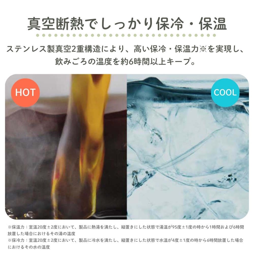※保冷力:室温20度±2度において、製品に冷水を満たし、縦置きにした状態で水温が4度±1度の時から6時間放置した場合におけるその水の温度