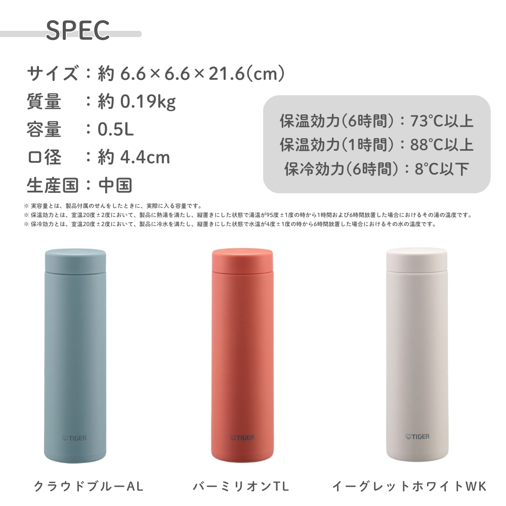 商品名: タイガー魔法瓶 真空断熱ボトル MMZ-C050 水筒 500ml 保冷 保温 洗いやすい 直飲み 軽い 軽量 ステンレス 食洗機対応 シンプル スポーツドリンク対応 マグ マイボトル 小さめ 熱中症対策 持ち運び
