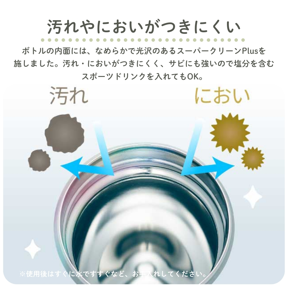 ボトルの内面には、なめらかで光沢のあるスーパークリーンPlusを施しました。汚れ・においがつきにくく、サビにも強いので塩分を含むスポーツドリンクを入れてもOK。