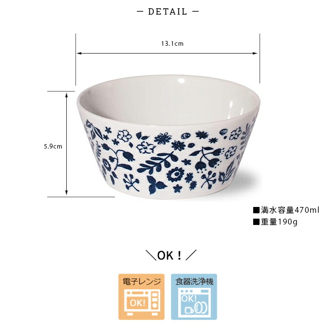 ▼サイズ:約径13.1×高5.9cm ▼満水容量:約470ml ▼重量:約190g ▼原産国:日本 ▼材質:磁器 ▼電子レンジ:可