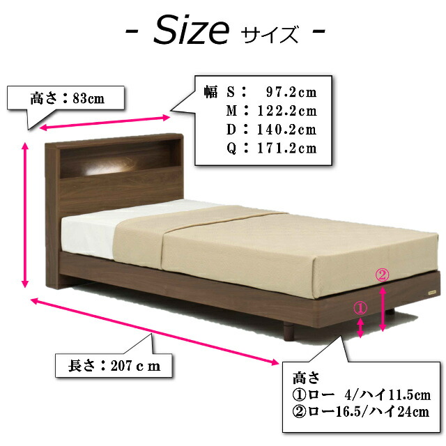 セミダブル:幅1222×長さ2070×高さ830×マットレス面高さ ハイ:440/ロー:365mm(床高2段階対応)