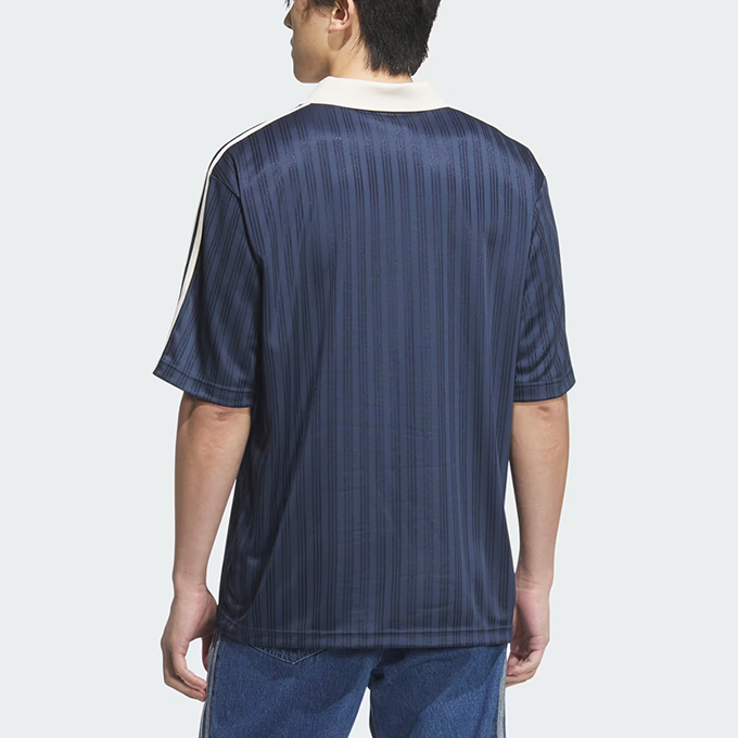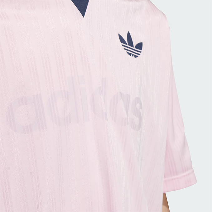 総柄のストライプの生地で、袖にスリーストライプスを配し、胸にアディダスのブランディングをあしらいクラシックな雰囲気に仕上げている。