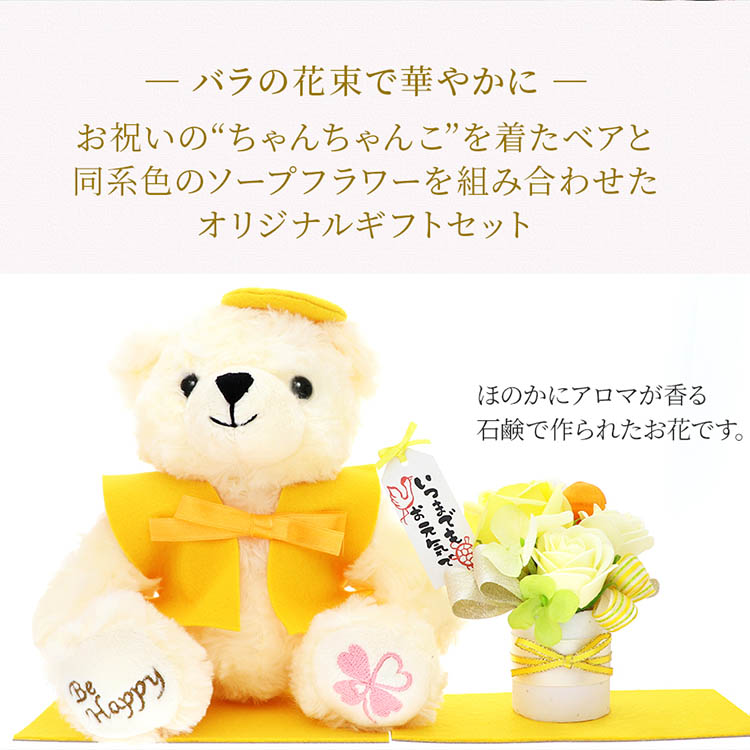 黄色いベストと帽子のコスチュームがかわいらしいベアがお花を届ける華やかなギフト。黄色は太陽を思わせる色で見ているだけで明るい気分にさせてくれるカラー。長寿を祈って贈る敬老の日のギフトにもピッタリです。お花はきれいな色味が色褪せず長く楽しめるアートフラワーを使用。ケース付きなのでそのままお部屋でインテリアとして長くお楽しみいただけます。ベアのもつピックには「いつまでもお元気で」とのメッセージがついています。かわいいベアとやさしいメッセージがおじいちゃん、おばあちゃんの心を和ませてくれそうです。・お手提げ袋。・無料プレゼント!ご希望の方には「お花ソムリエ」オリジナルメッセージカード。(4行各10文字迄)※メッセージカードを“無料”でプレゼントしております。無料印刷付 4行、10文字/行※プリザーブドフラワーは形状、色合いなどは個体差があるため、写真とは多少異なる場合がございます。※入荷状況により花の色味・資材の一部が仕様、および商品パッケージが変更される場合がございます。(一部アートフラワーを使用しています)※ご覧いただいているデバイスによって、実際の商品の色合いや明るさなどのイメージが異