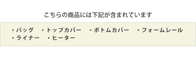 ・表示価格にはバッグ・トップカバー・ボトムカバー・フォームレール・ライナー・ヒーターが含まれています。単品でもご購入可能です。(料金等はお問い合わせください)