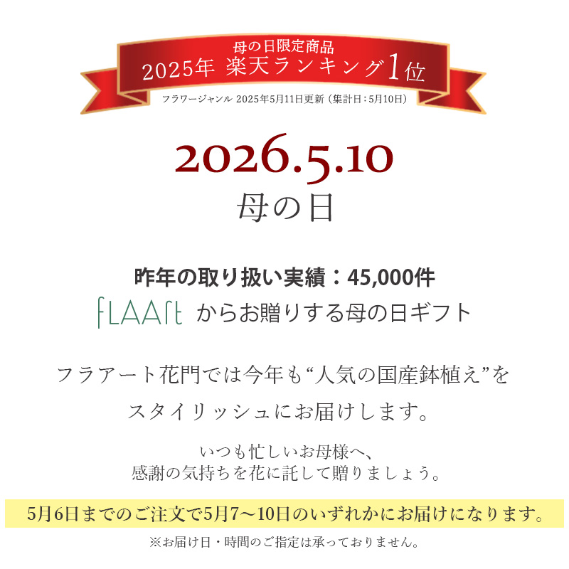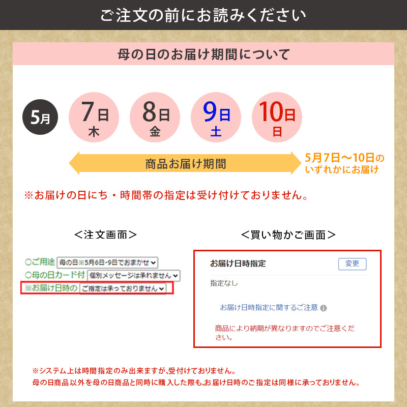 ※母の日期間中は、全国的にご注文が増え、配送業者も荷物が混雑し、お届けの遅延が発生する場合がございます。そのためこの期間中は、配達日時指定を受け付けておりません。何卒ご理解のほどよろしくお願いいたします。