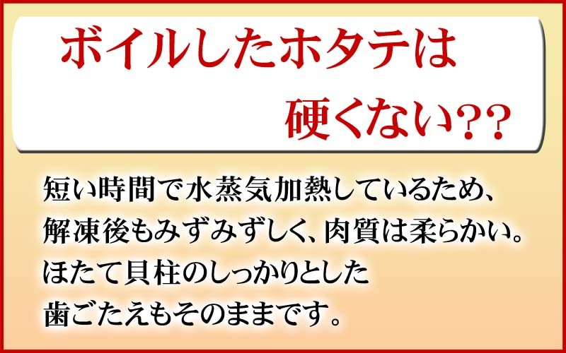 ほたてをむき身にして、水蒸気加熱でボイルした、柔らか貝柱。