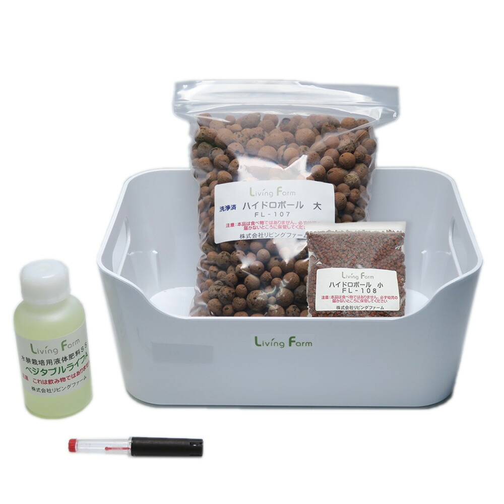 ハイドロボール、液体肥料など、リビングファーム水耕栽培方式で、育成に必要なアイテムがセットになっています。
