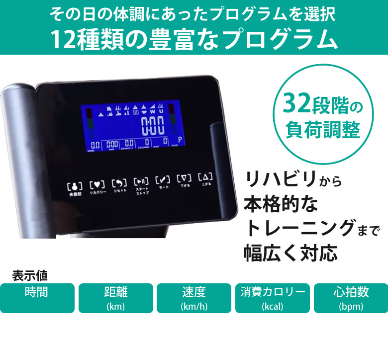 9.12種類の豊富な負荷変化プログラムの中から、その日の体調にあったプログラムを選択して頂けます。
