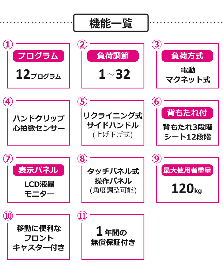 10.負荷調整が32段階もあるのでリハビリから本格的なトレーニングまで幅広く対応できます。