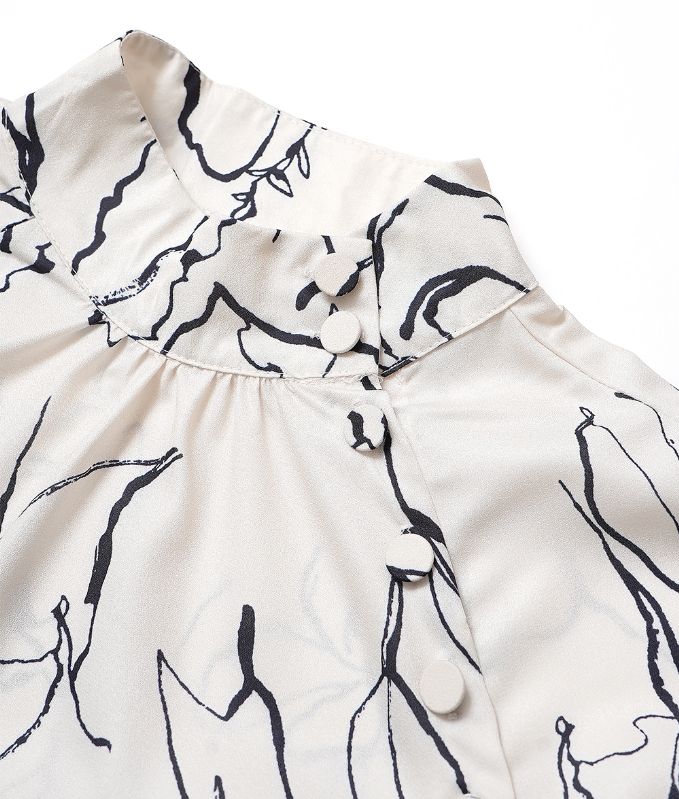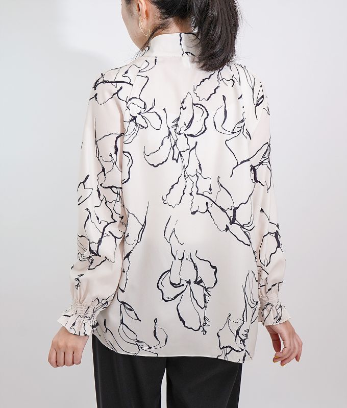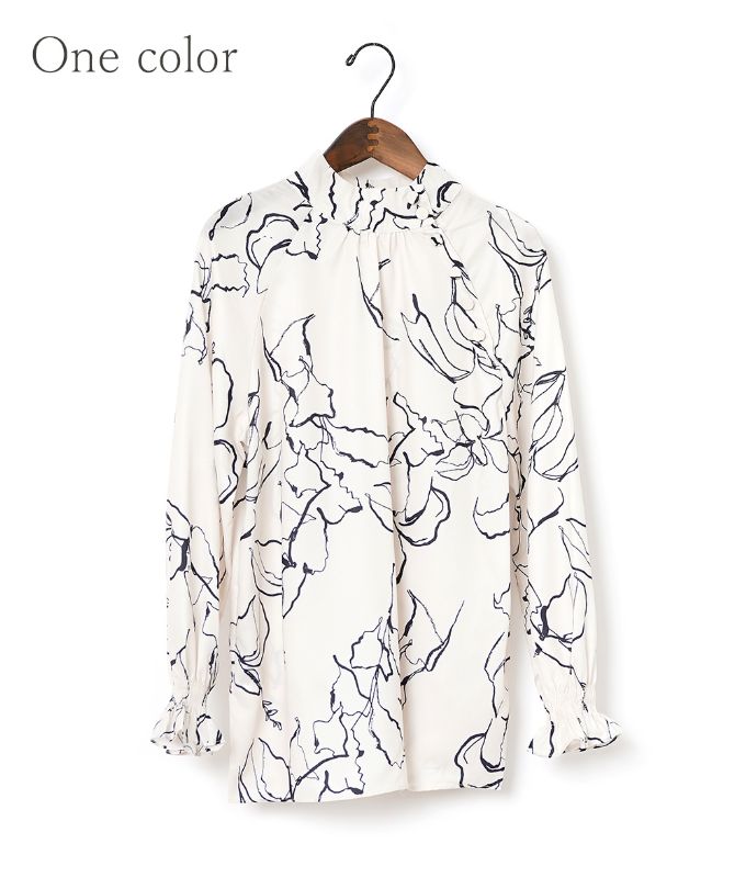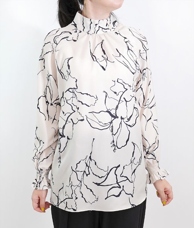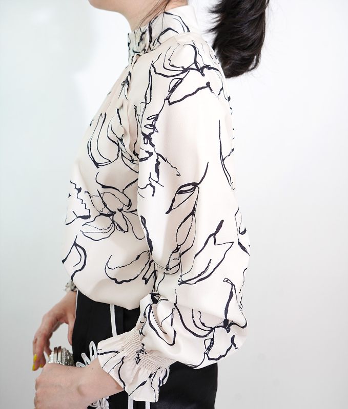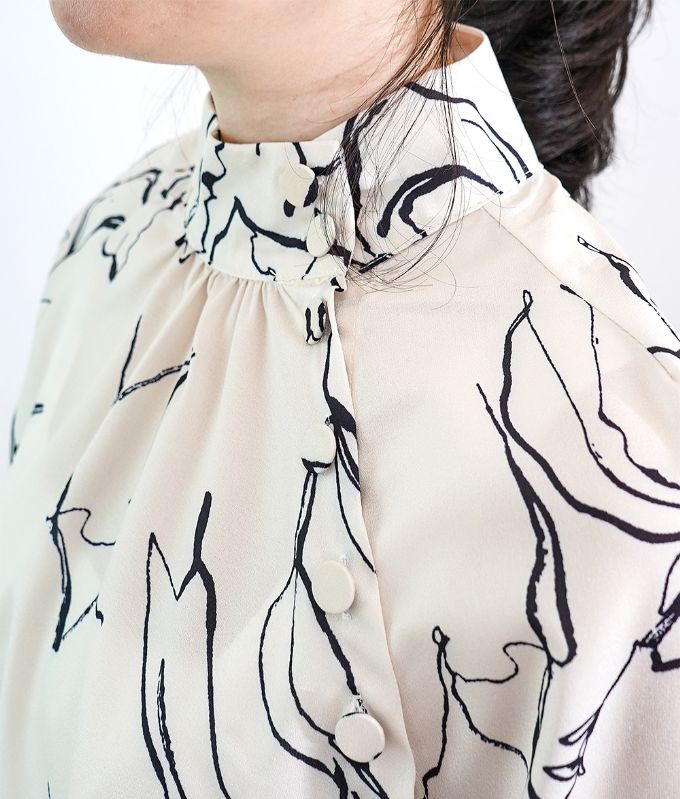 モノトーンの手書きのような線画模様が上品なハイネックブラウス。ハイネックの高め襟とキャンディースリーブのギャザーが大人っぽくアクセントに。シフォン生地のさらさらした生地感で肌にまとわりつかず柔らかい着心地です。落ち着いたカラートーンできれいめ上品アイテムなのでフォーマルコーデやオフィスコーデにもおすすめです。※生地の裁断により、柄の出方が違う場合がございますので、予めご了承下さい。