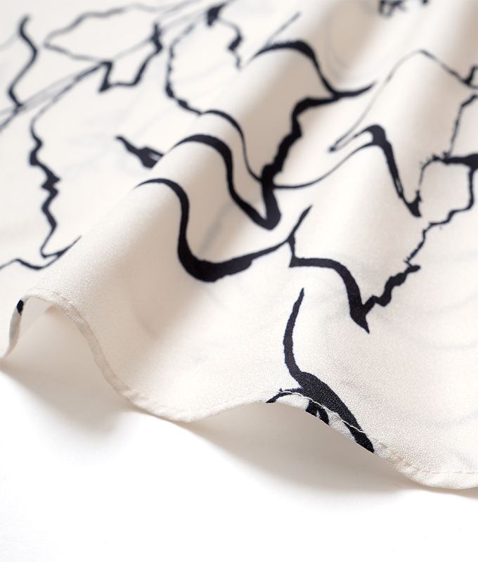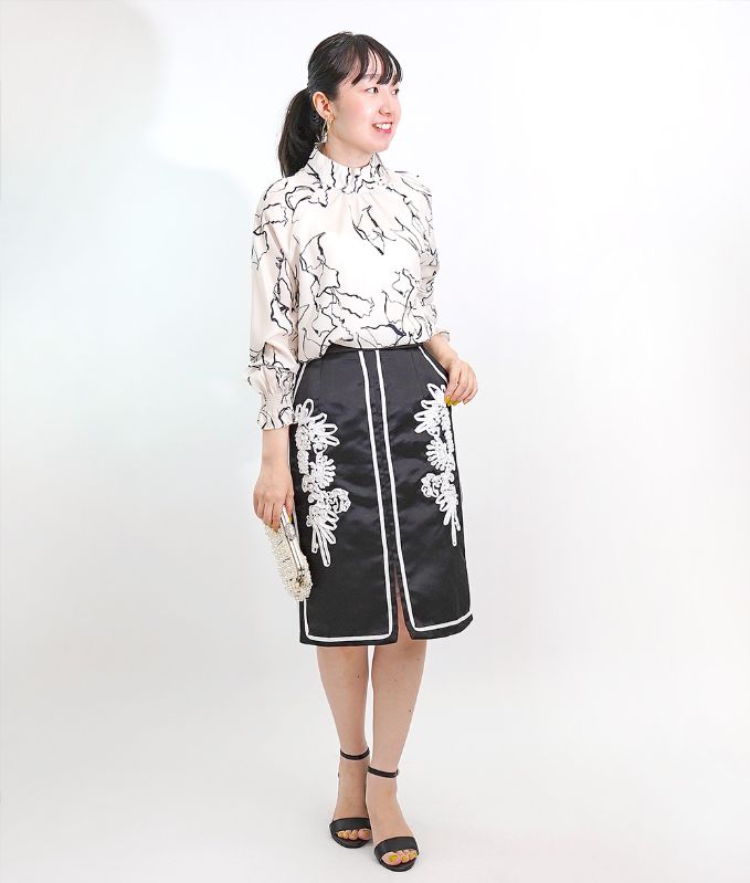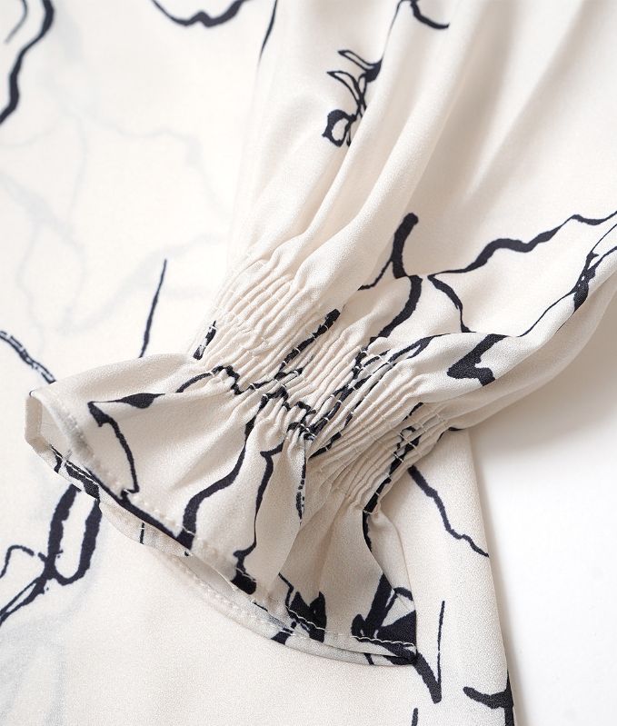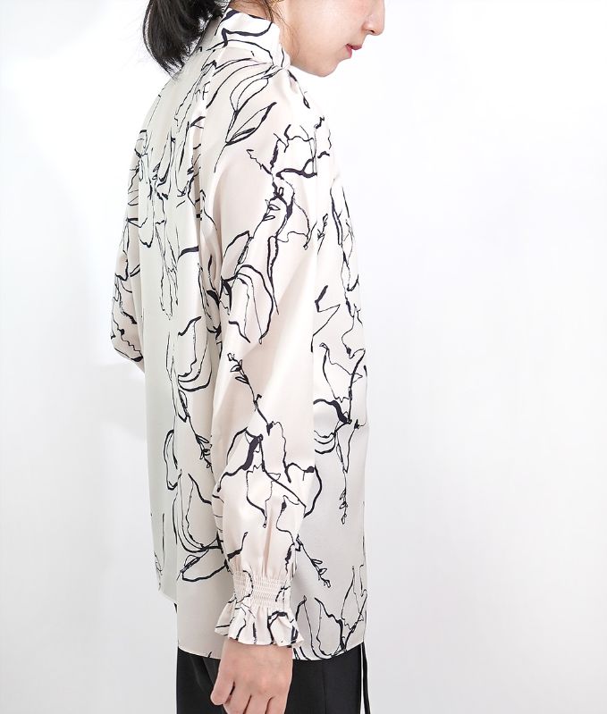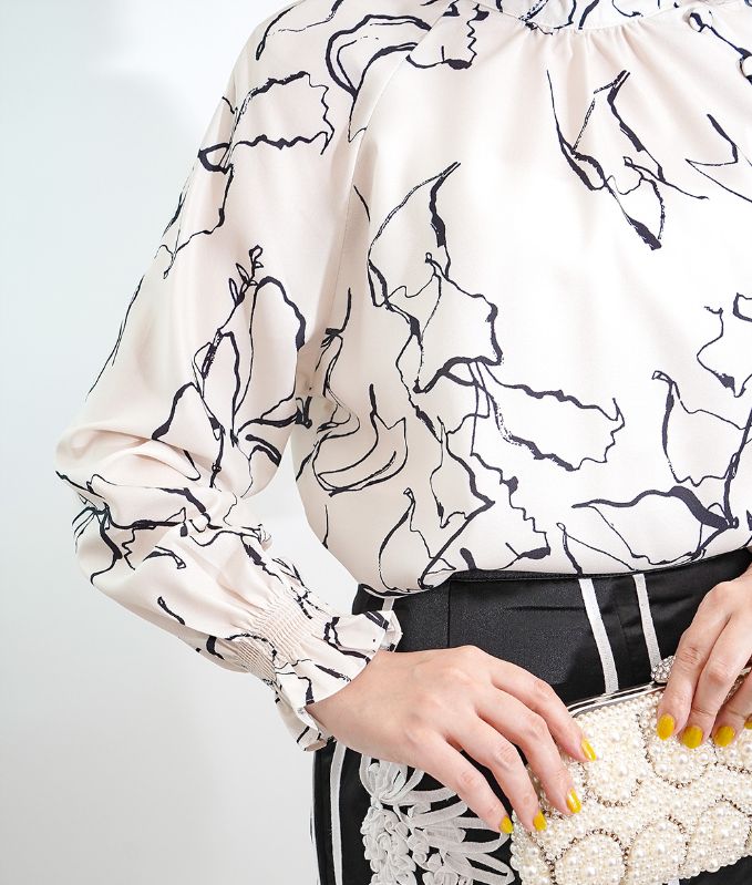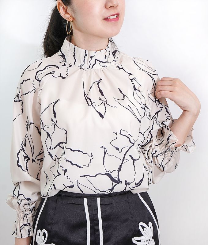 モノトーンの手書きのような線画模様が上品なハイネックブラウス。ハイネックの高め襟とキャンディースリーブのギャザーが大人っぽくアクセントに。シフォン生地のさらさらした生地感で肌にまとわりつかず柔らかい着心地です。落ち着いたカラートーンできれいめ上品アイテムなのでフォーマルコーデやオフィスコーデにもおすすめです。※生地の裁断により、柄の出方が違う場合がございますので、予めご了承下さい。