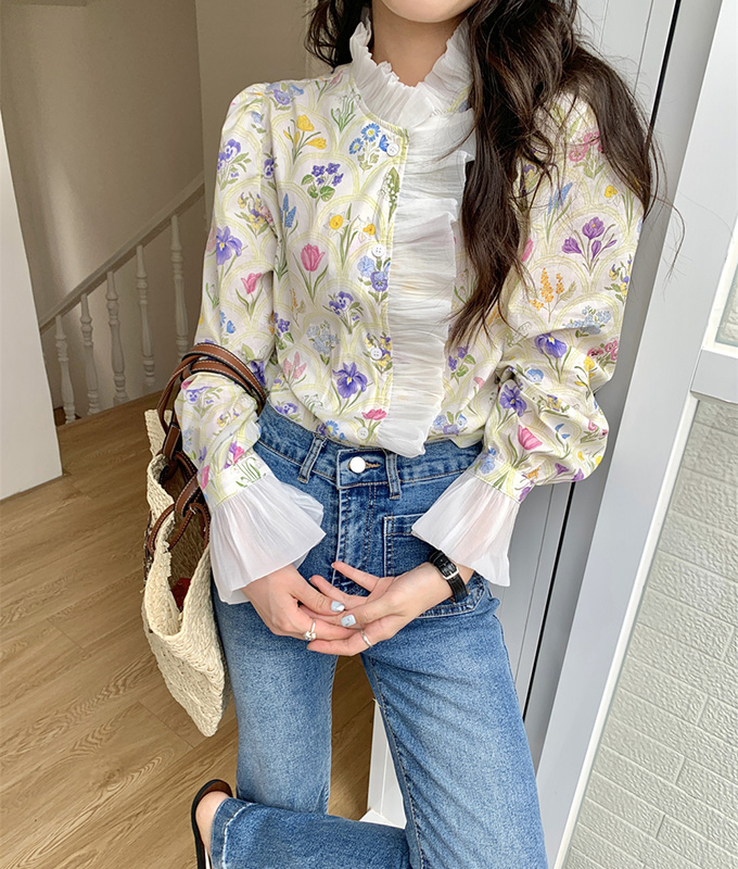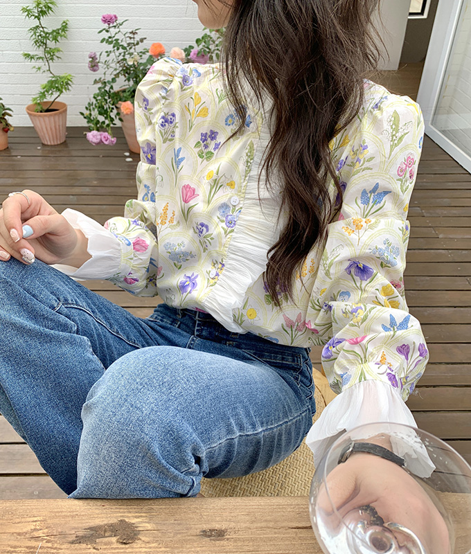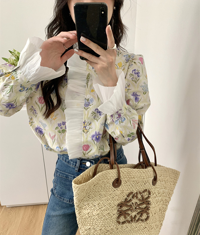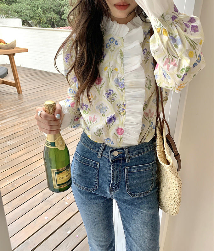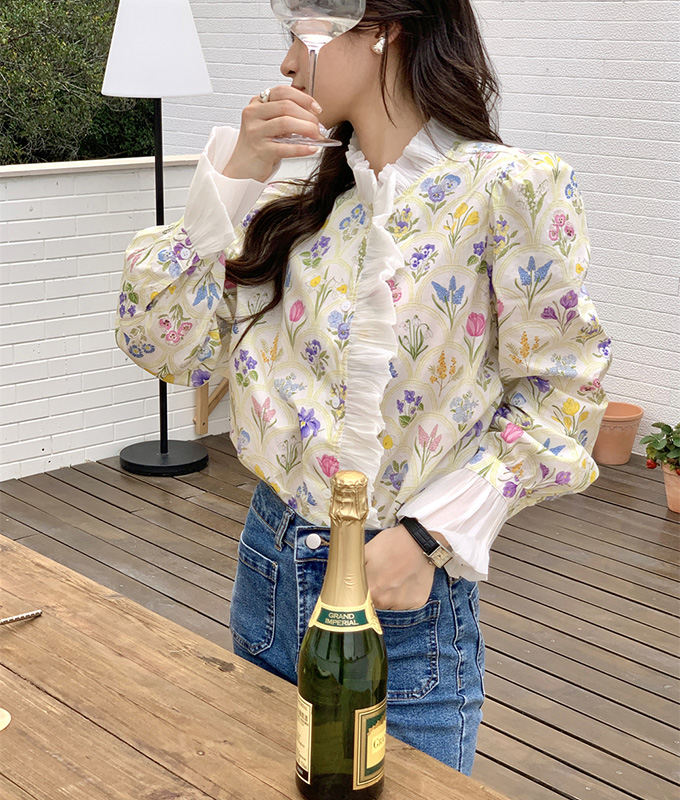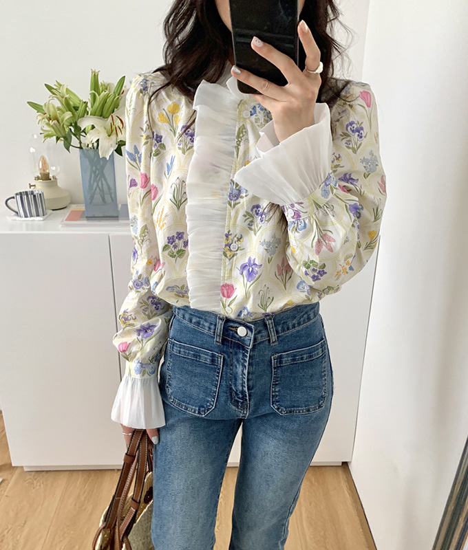 豪華なラッフルと可憐なお花模様が唯一無二なフェミニンブラウストップス。
