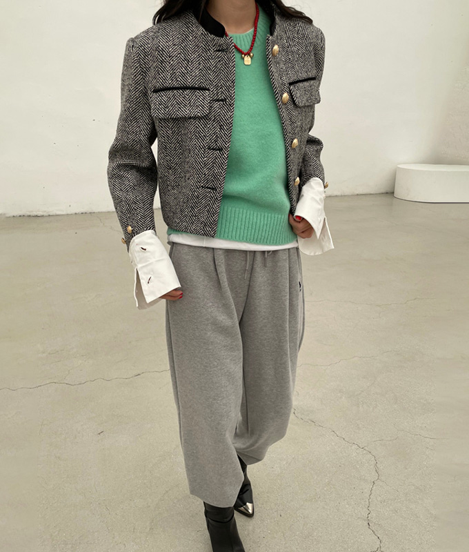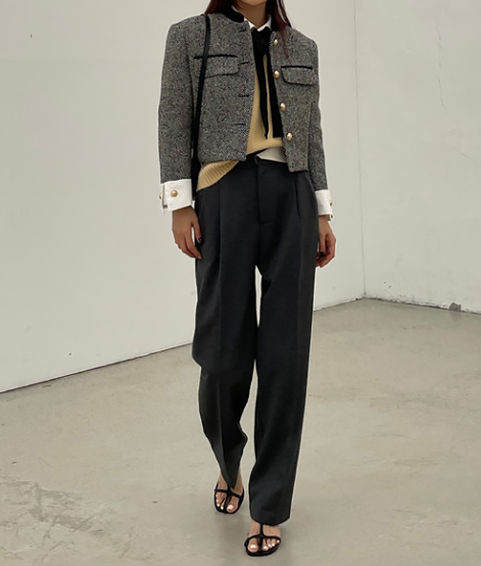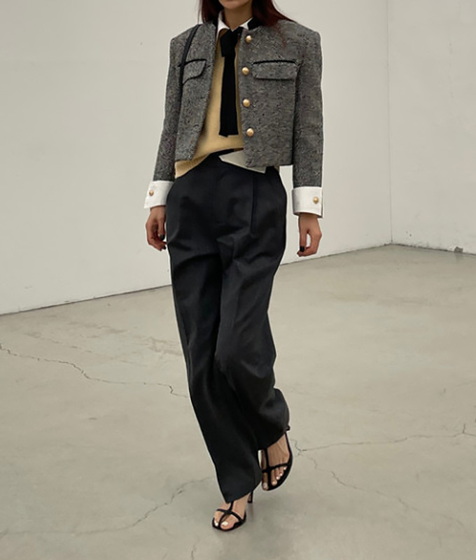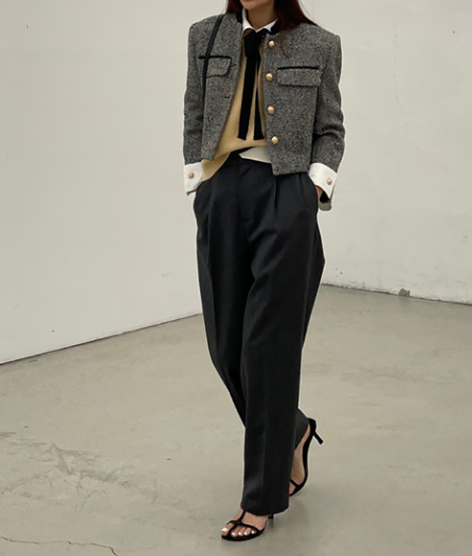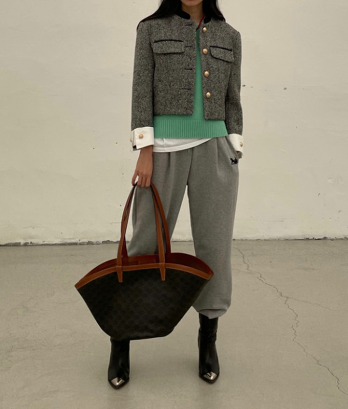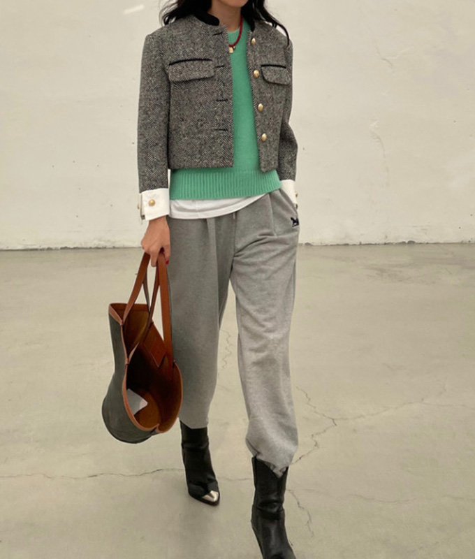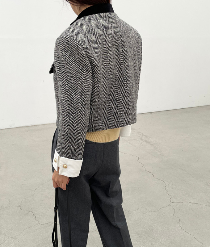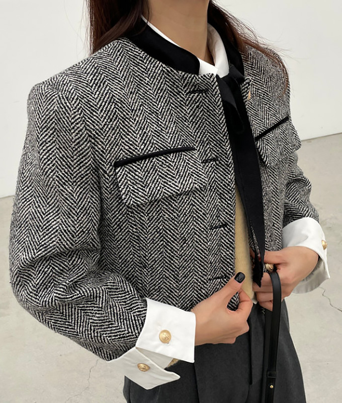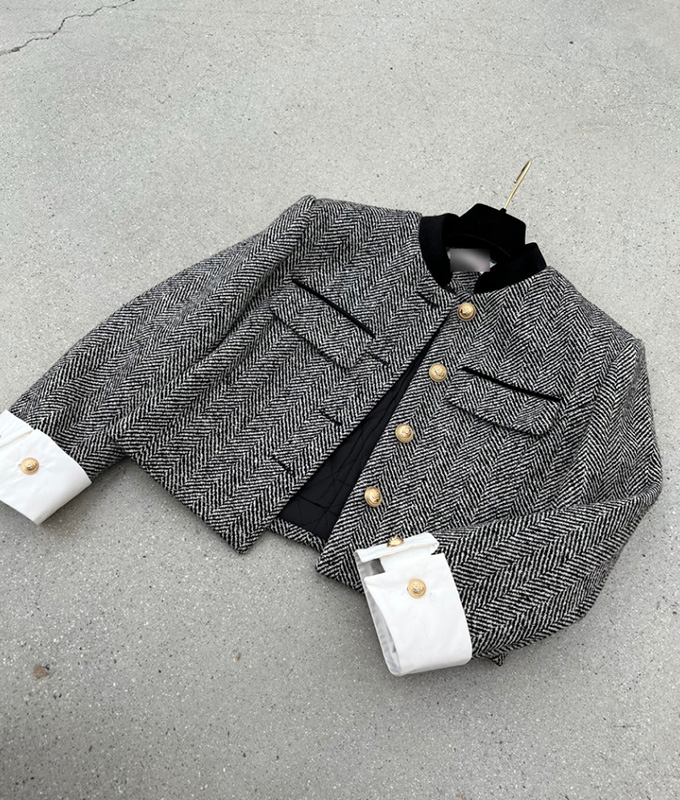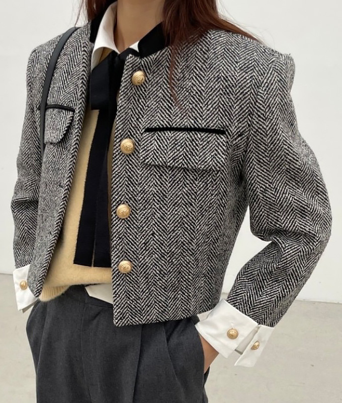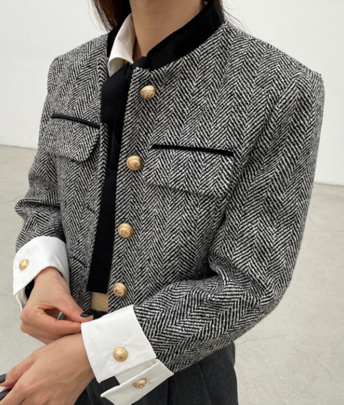 送料無料 アウター ジャケット ショート丈 ノーカラー スタンドカラー 配色 ツイード メタルボタン カフス 重ね着風 レイヤード風 グレー「cawaii french」