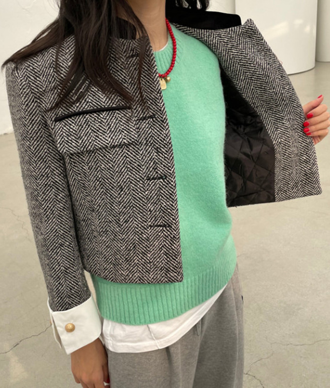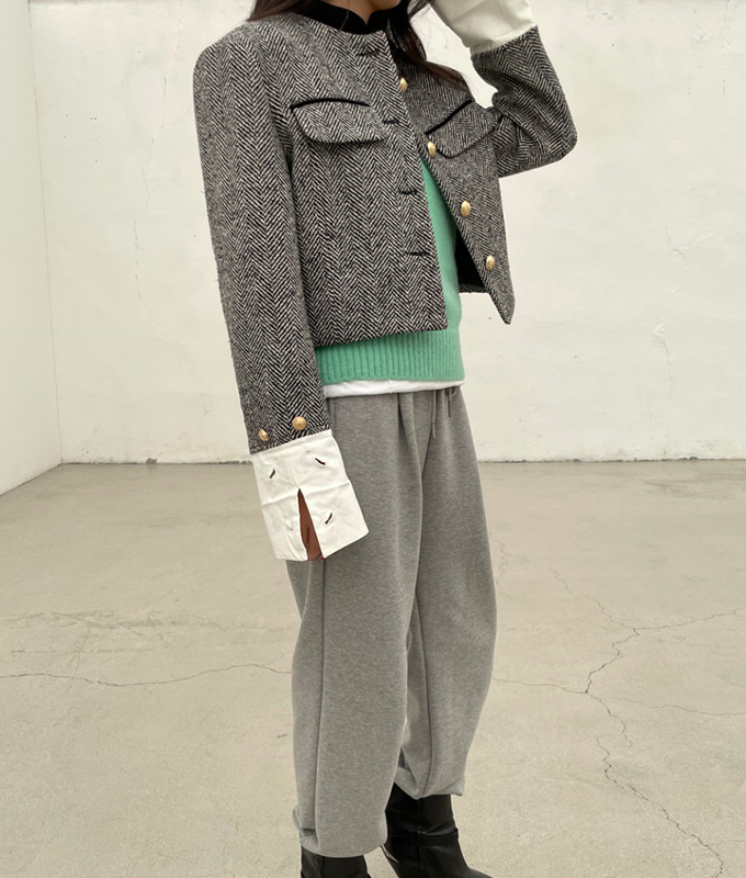 重ね着風の袖カフスがポイントのツイードスタンドカラーショートジャケット。