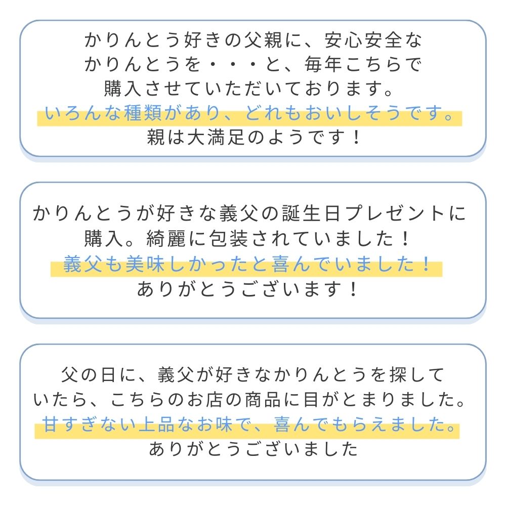 母の日、父の日、敬老の日、誕生日、クリスマスなど、定番のギフトイベントにかりんとうのプレゼントを贈ってみませんか。
