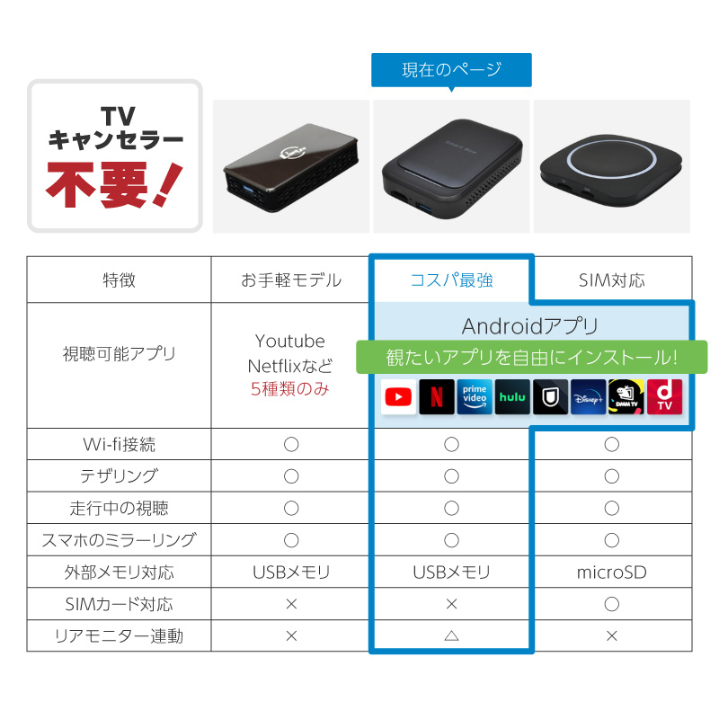 ■ 機能 : YouTube、Netflix、TVer等動画アプリ、グーグルマップ、通話、Bluetooth音楽再生、USBメモリ再生