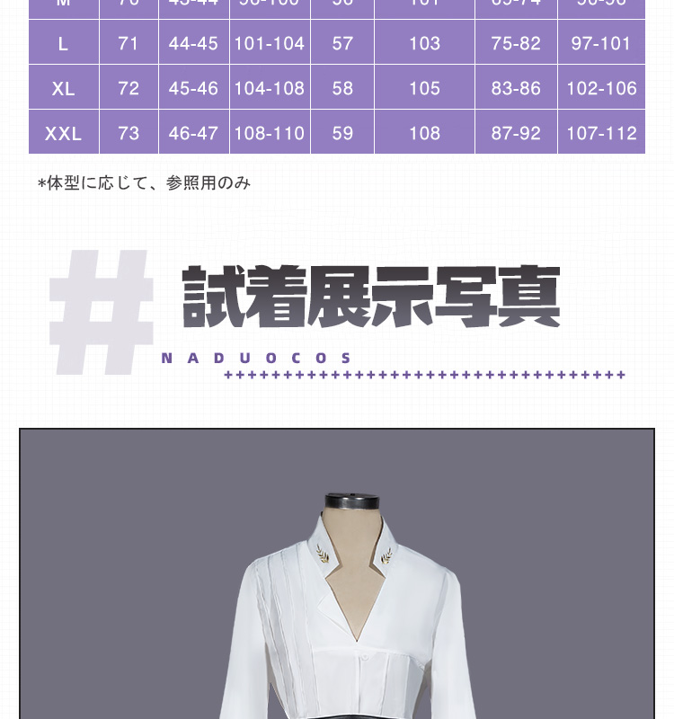 ※動く為に仕上がりサイズはヌードサイズより3〜5CMゆとりが持っております。予めご了承ください。