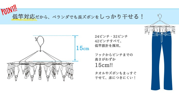・マンションのベランダなどに最適な低竿対応なので、ジーンズやタオルなどの長物干しに便利です。