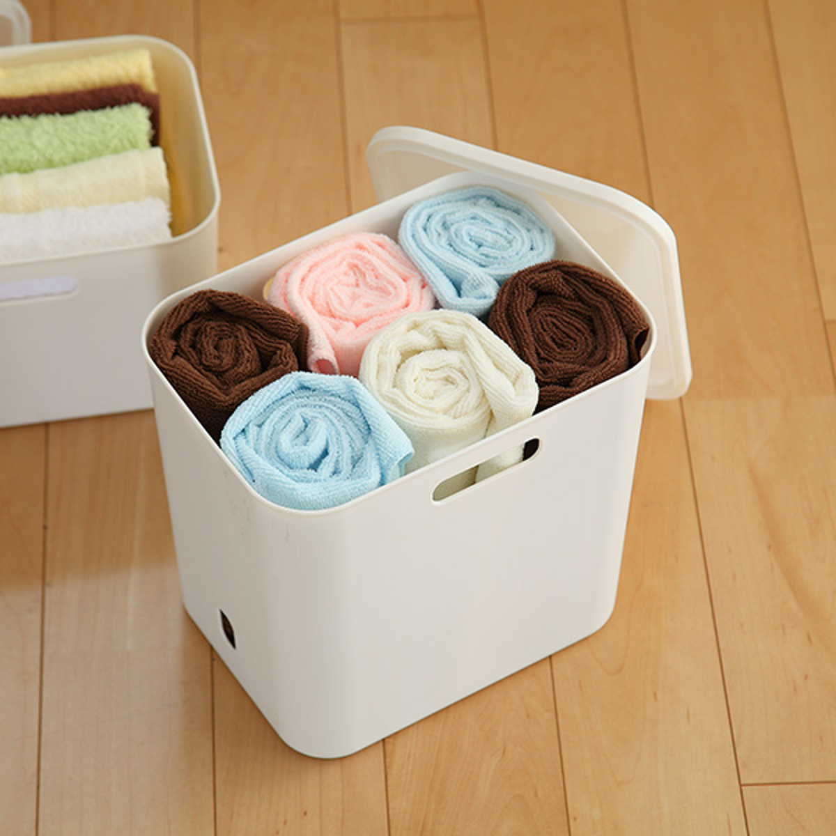正面一か所にある楕円の穴は、棚の上やベッド下などにあるボックスを引き出す際に役立ちます。また中身を確かめる際にも便利です。
