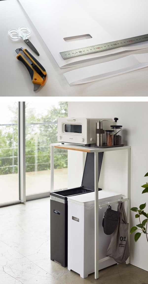 本体の上部をカットして高さを自由に調節できます。キッチンラック下などの高さ制限がある場所でも、調整して頂く事で設置する事ができます。また、折りたたんで薄く持ち運べるのでアウトドアにもピッタリです。