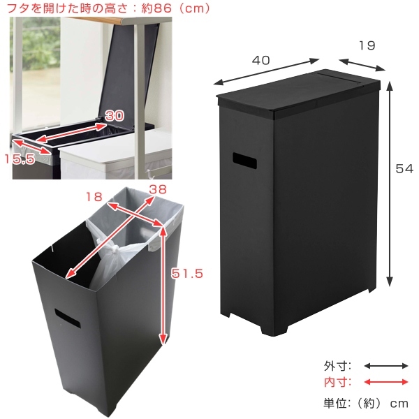 キッチンの空間を有効に使える約幅19cmのサイズは、冷蔵庫・シンク・食器棚横などのキッチンのデッドスペースに置く事ができます。スリムなので複数置いて、生ゴミ・空き缶・プラスチックゴミなどの分別にも最適です。