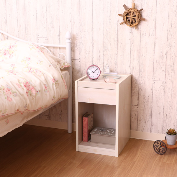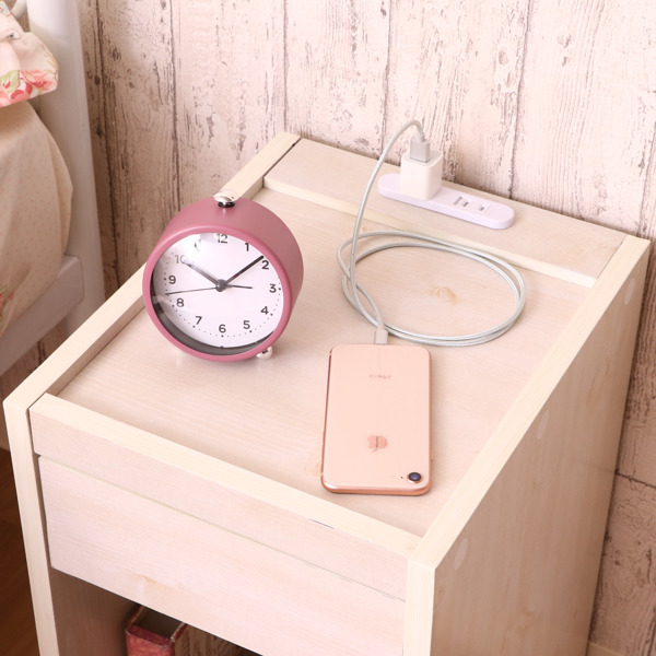 シンプルなベッドサイドテーブルは、優しい木目調のプリント紙化粧繊維板を使用していて、どんなインテリアにも馴染みます。うれしい2口コンセント付きです。