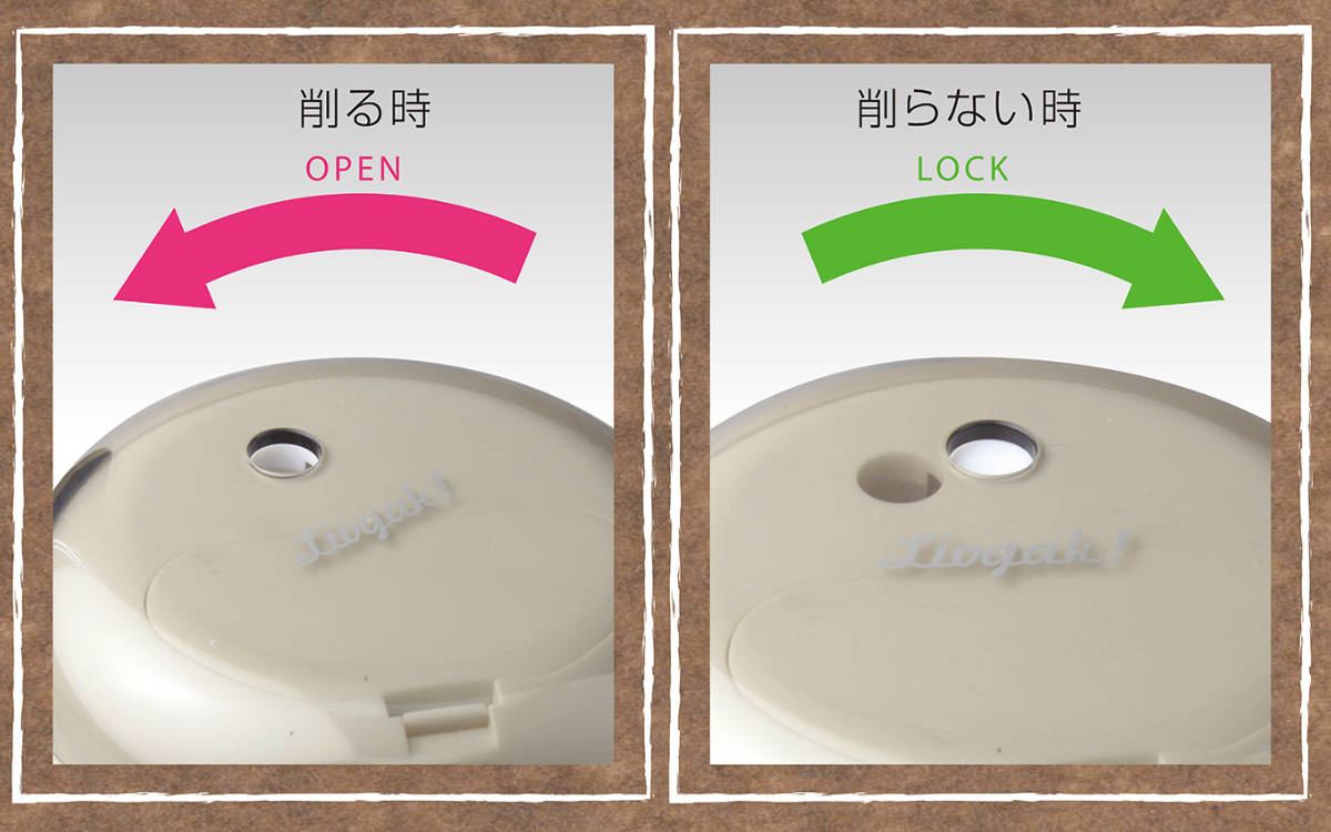 鉛筆挿入口には、スライドロック機能が付いています。削らないときには簡単にロックすることができるので、お子様でも安全にお使いいただけます。