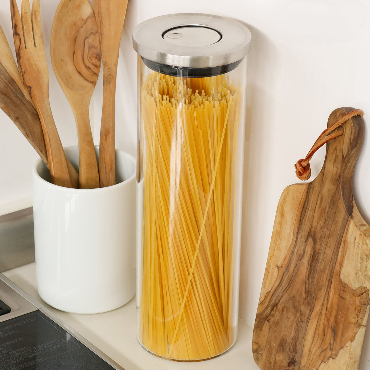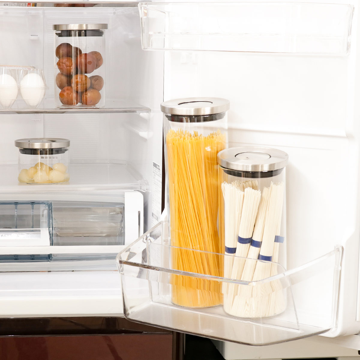スペースの限られた調理スペースやコンロ横にもすっきりと並べて置くことができます。キッチンでよく使用するパスタ類の乾燥食材を保存しておいたり、出汁パックや調味料を並べておくのにもおすすめです。