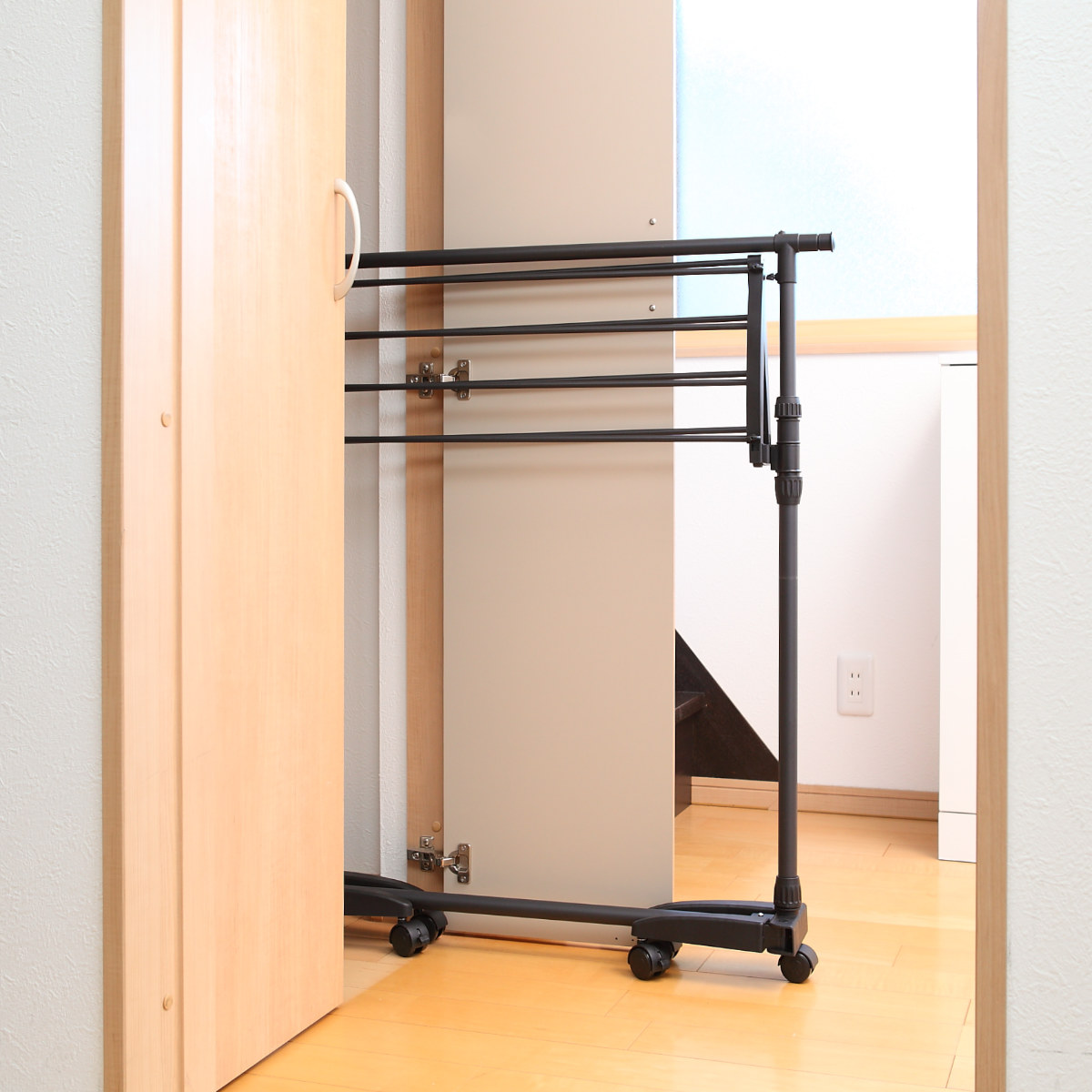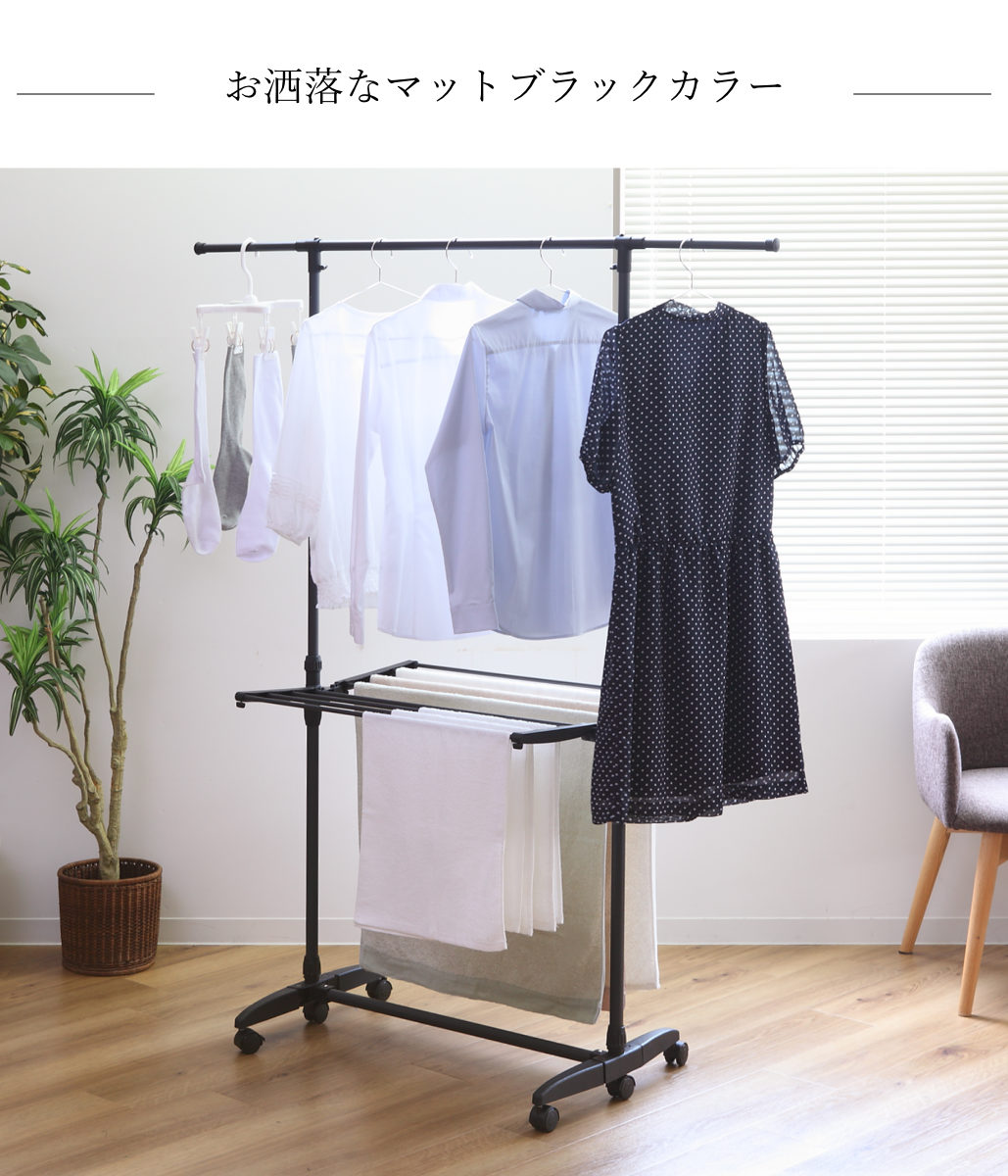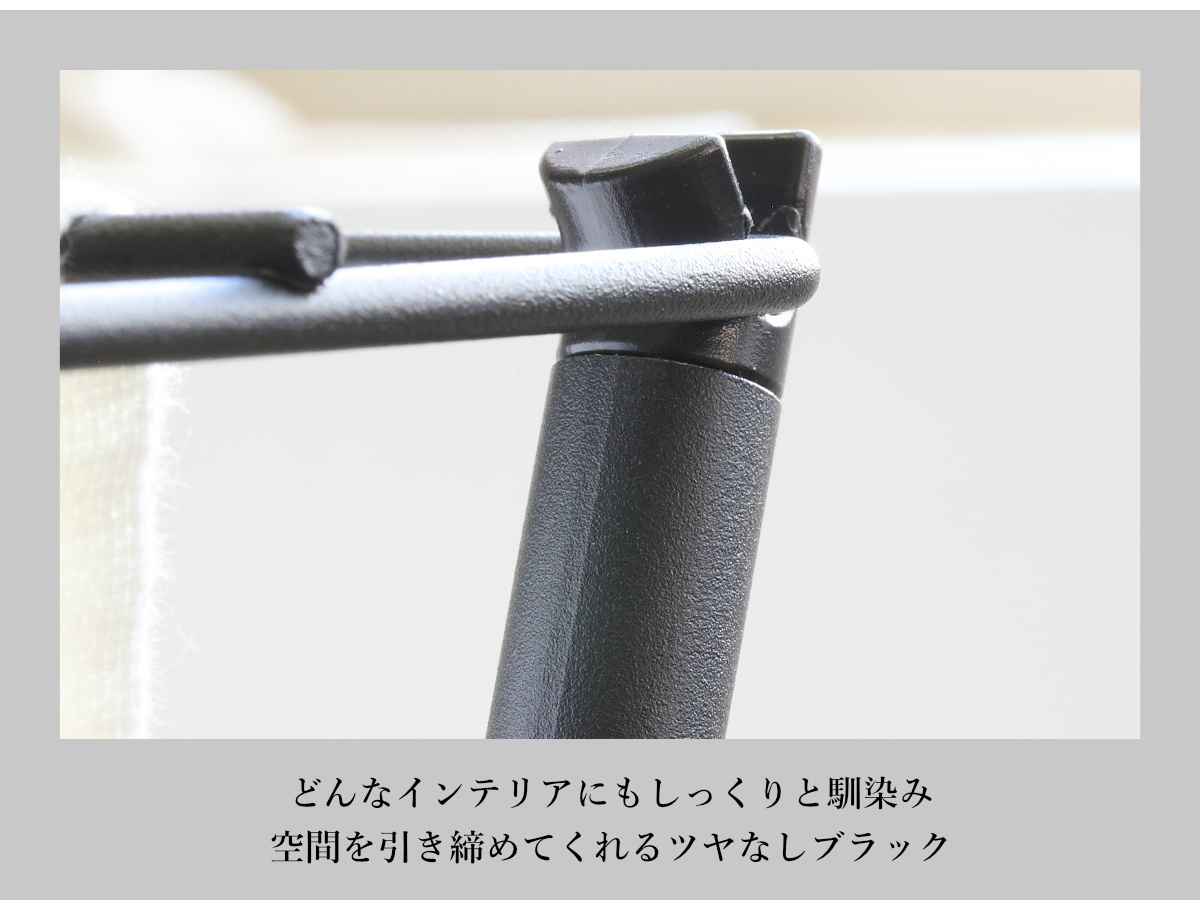 生活感が出やすい物干しも、落ち着いたブラックカラーなら、空間を引き締めてインテリアに自然と溶け込みます。指紋やホコリが目立ちにくいため使いやすく、シンプルながら洗練された印象を与える、見た目と実用性を兼ね備えた1台です。