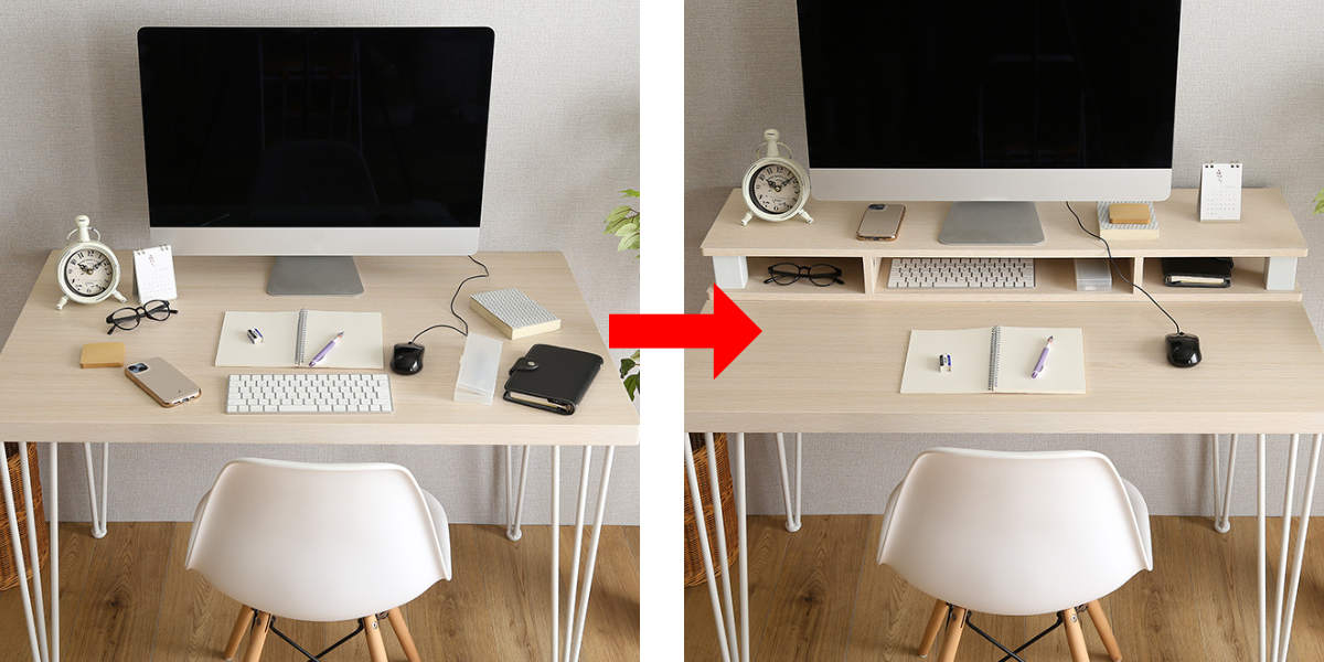 ●デスク上で使うとモニターの高さ調節ができ、小物も収納できて机の上がすっきりします。