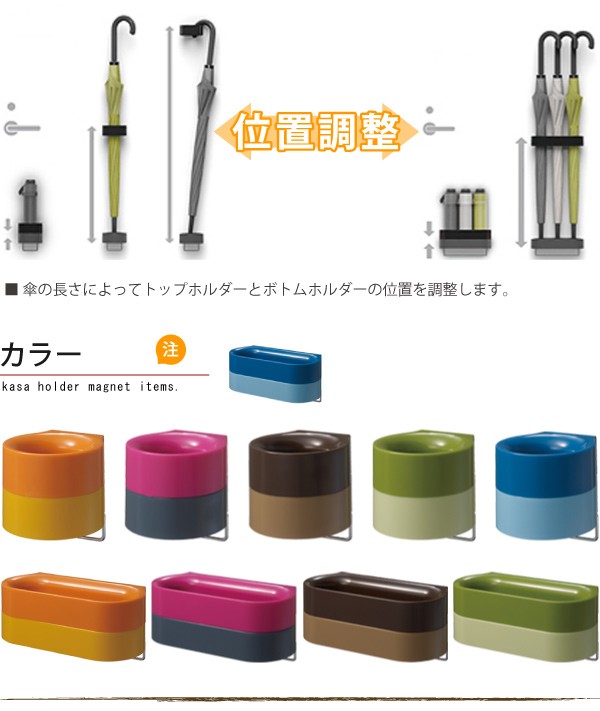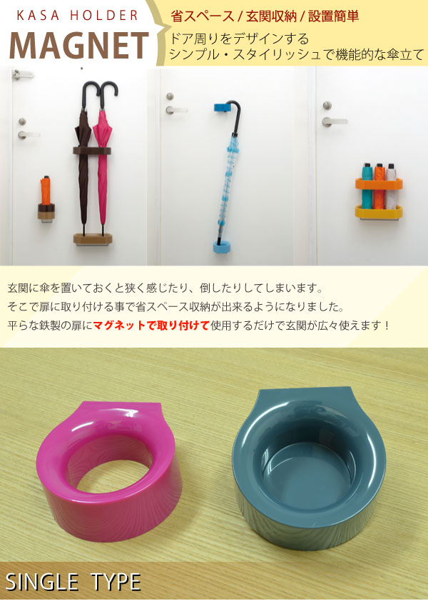 マグネットでドアにつけるだけで省スペースな傘立てがつくれます【商品詳細】サイズ:約 幅22.3×奥行10.2×高さ4cm 内容量:1個 材質:本体/スチロール、磁石カバー/ポリプロピレン、サポート材/鉄 カラー:ピンク、グリーン、オレンジ、ブルー、ブラウン《傘立て おしゃれ》