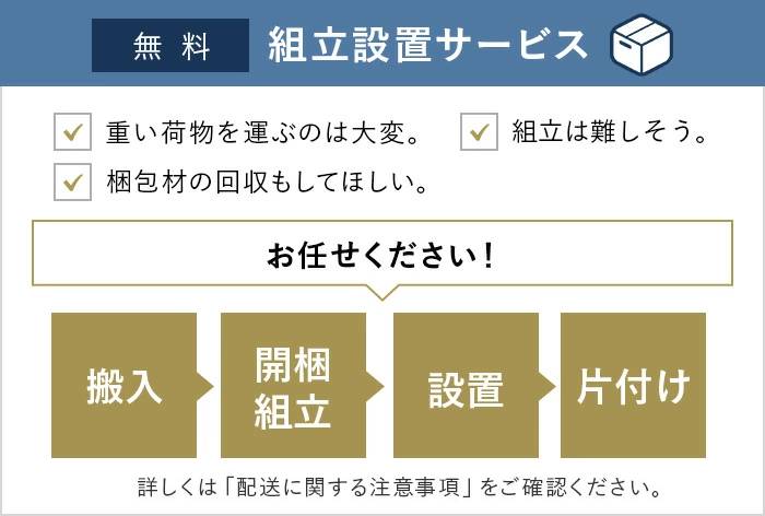搬入から片付けまでの組立設置サービス付きでまとめ買いでも組立の手間いらずです。