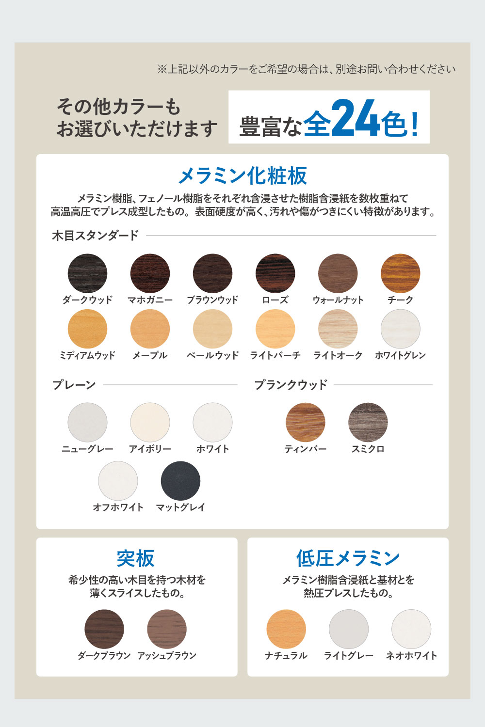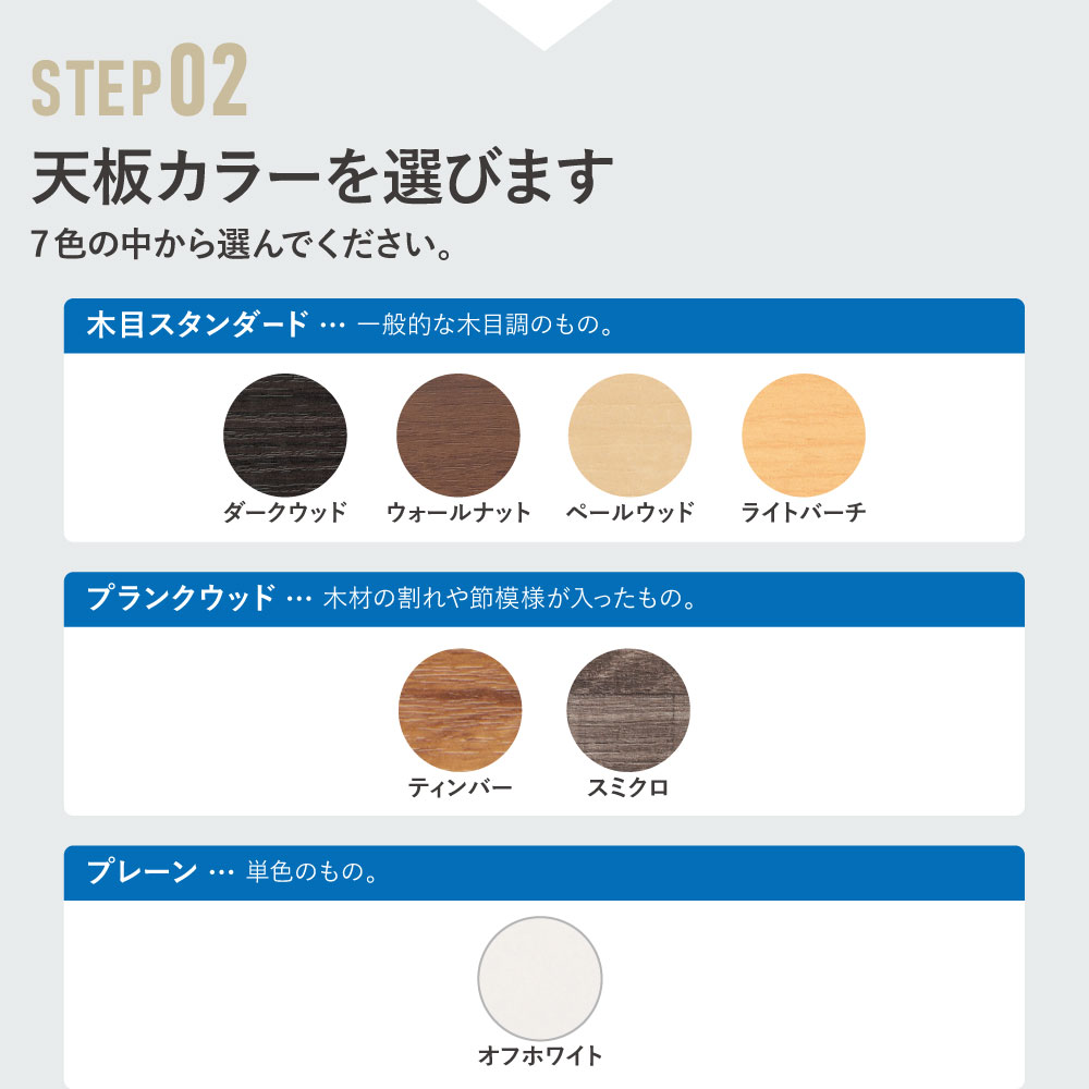 天板:ダークウッド、ウォールナット、ペールウッド、オフホワイト、ティンバー、スミクロ