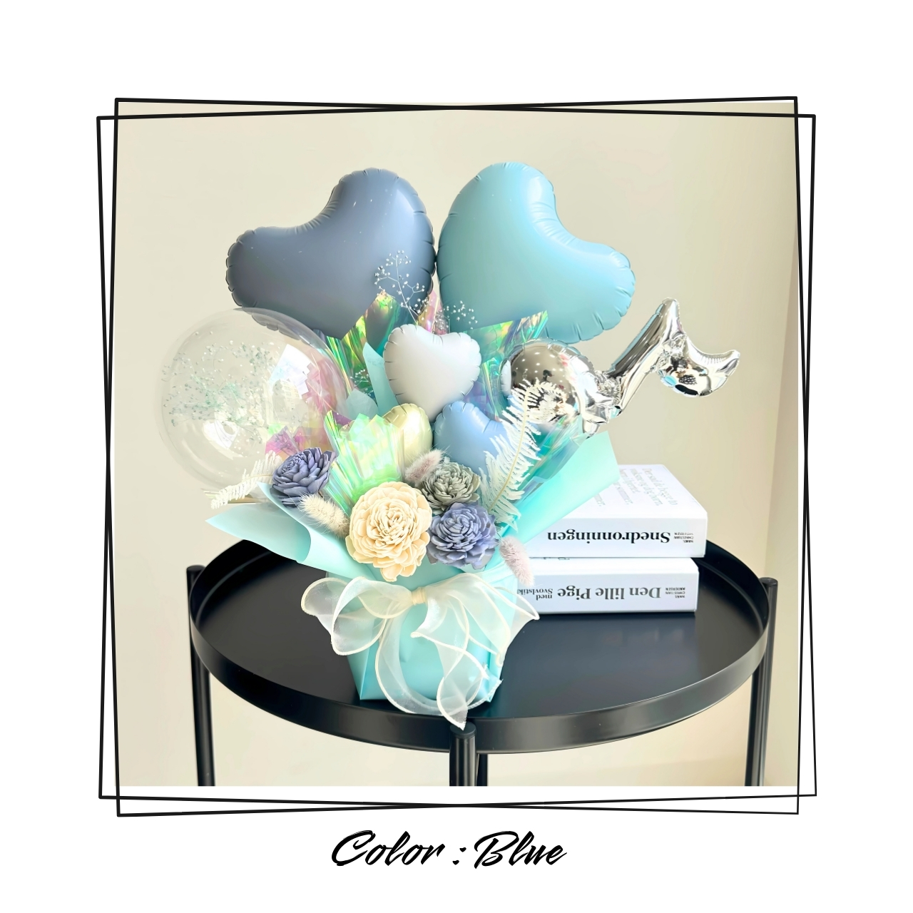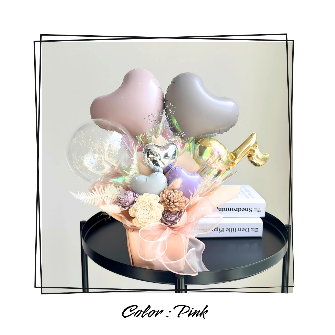特殊なフィルムで包まれたバルーンは膨らませた状態が1ヶ月以上続くので生花よりも長くお楽しみ頂けます。