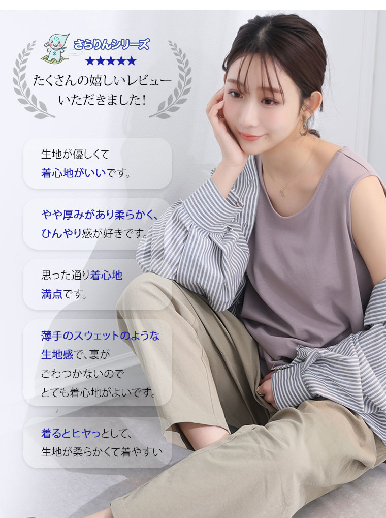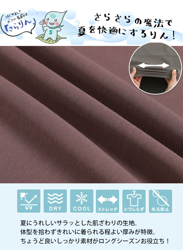 ■着用感:ちょうどいい、■着丈:お尻すっぽり、■バスト:ちょうどいい、■腕回り:ちょうどいい、■袖口:ちょうどいい、■袖丈:-、■首回り:ちょうどいい、■ウエスト:-、■ヒップ:-、■太もも:- ●さらさらとした涼しい冷感素材です。シンプルなデザインで色々なシーンで活躍してくれそうです!