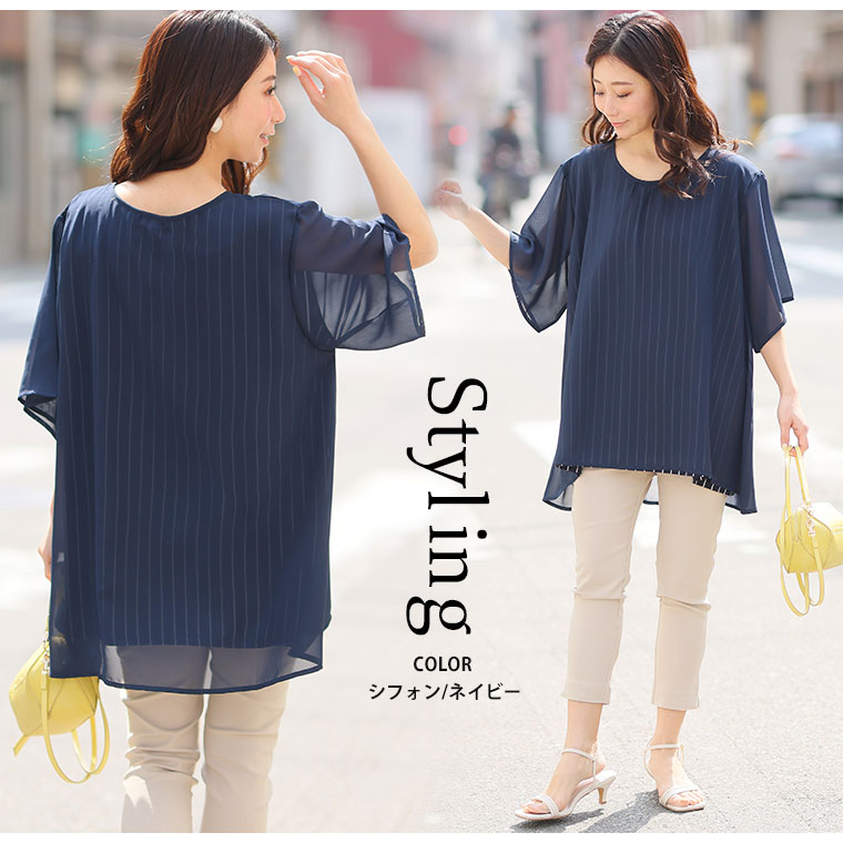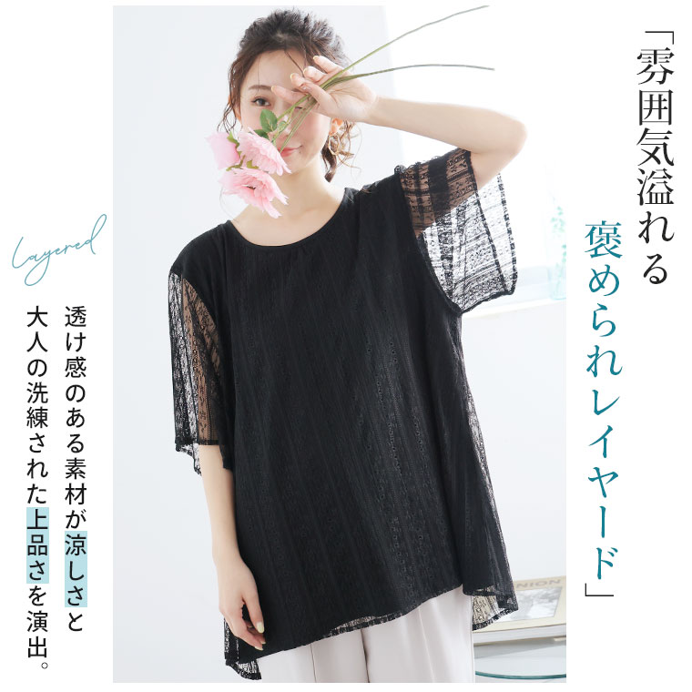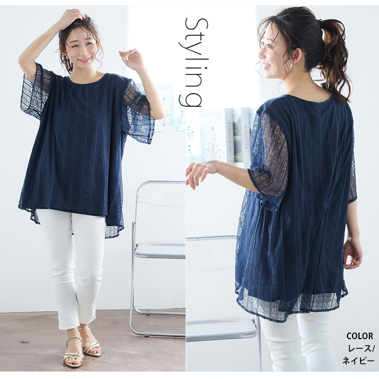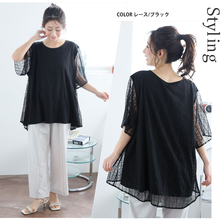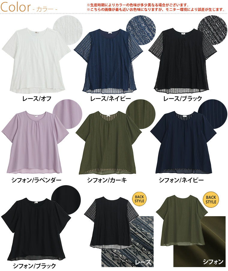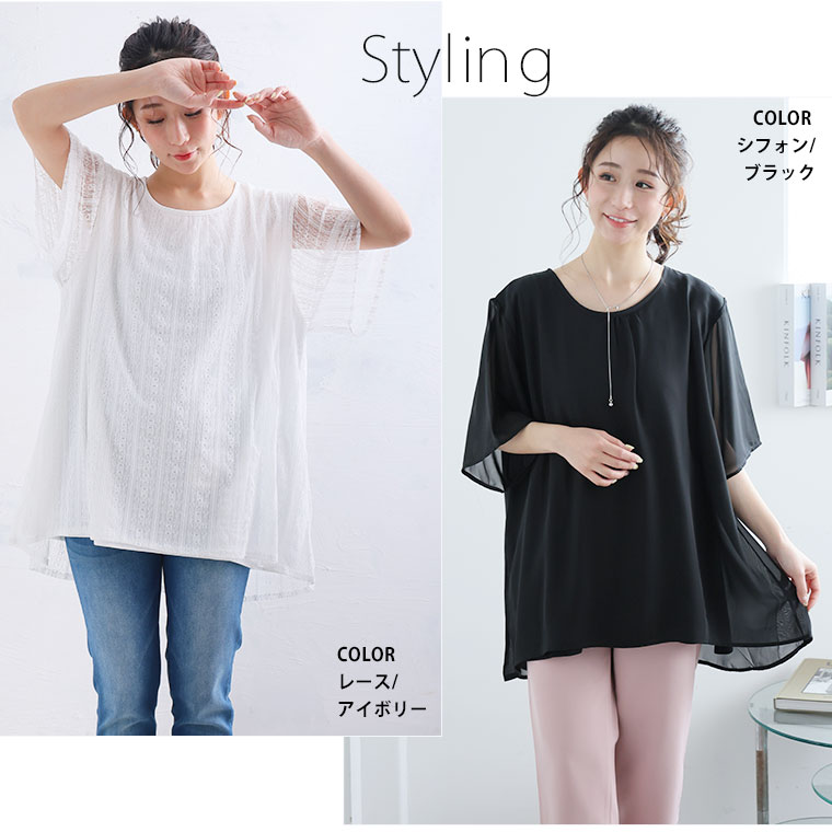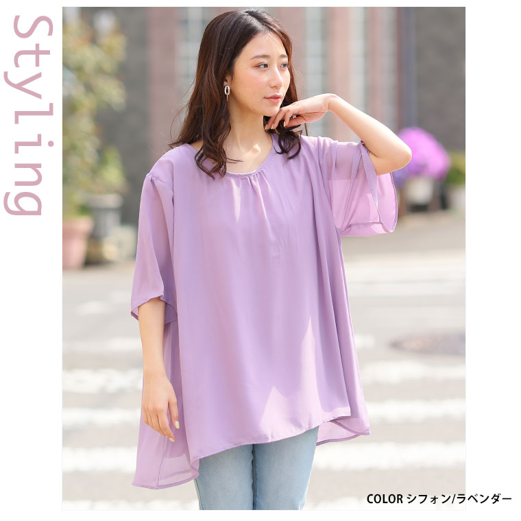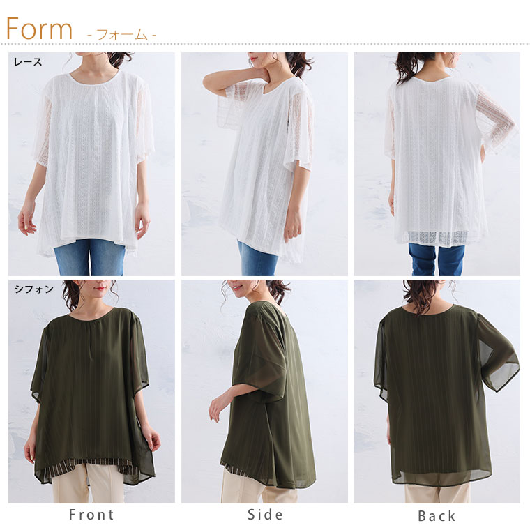 ■着用感:ややゆったり、■着丈:お尻下まですっぽり、■バスト:ややゆったり、■腕回り:ややゆったり、■袖口:ゆったり、■袖丈:肘上、■首回り:ちょうどいい、■ウエスト:-、■ヒップ:-、■太もも:- ●シフォンタイプを着用しました。透け感あるシアー素材が重ねてあるのがかわいい!レースタイプものも揃えて色んなシーンで着回したいですね!